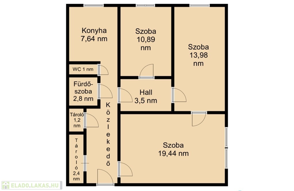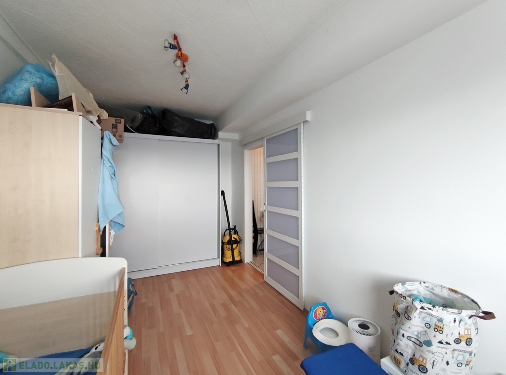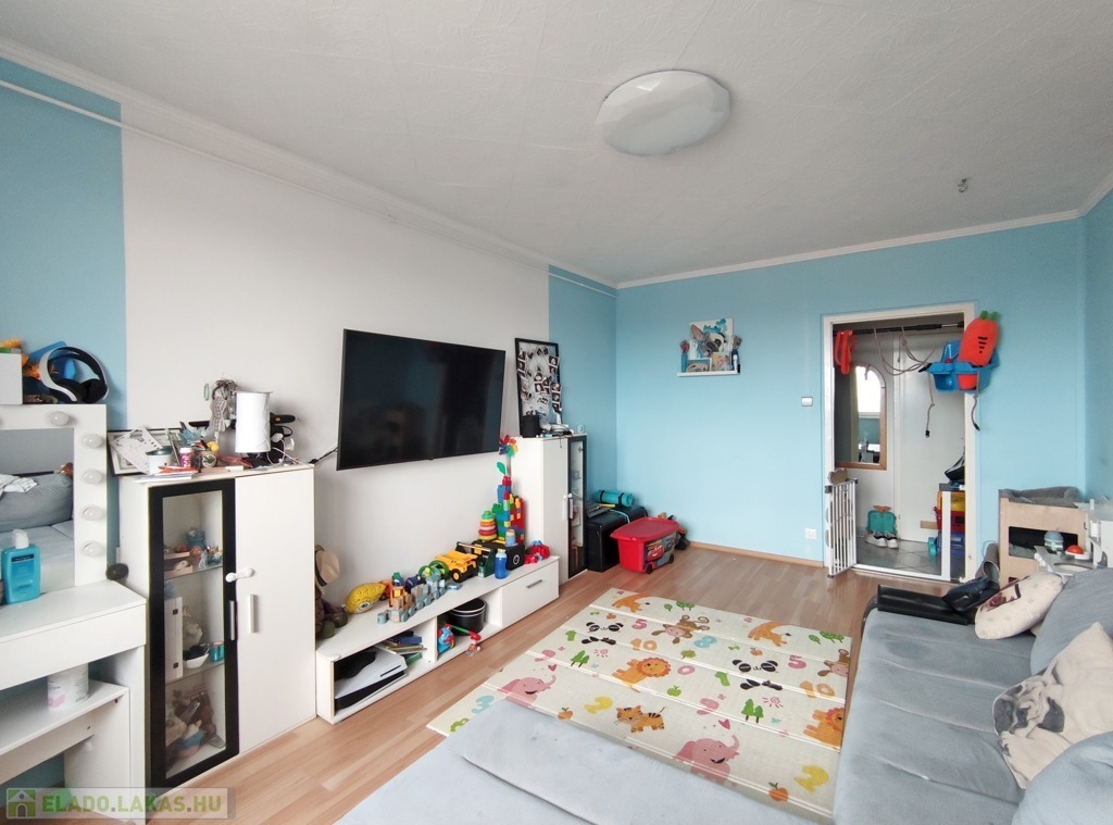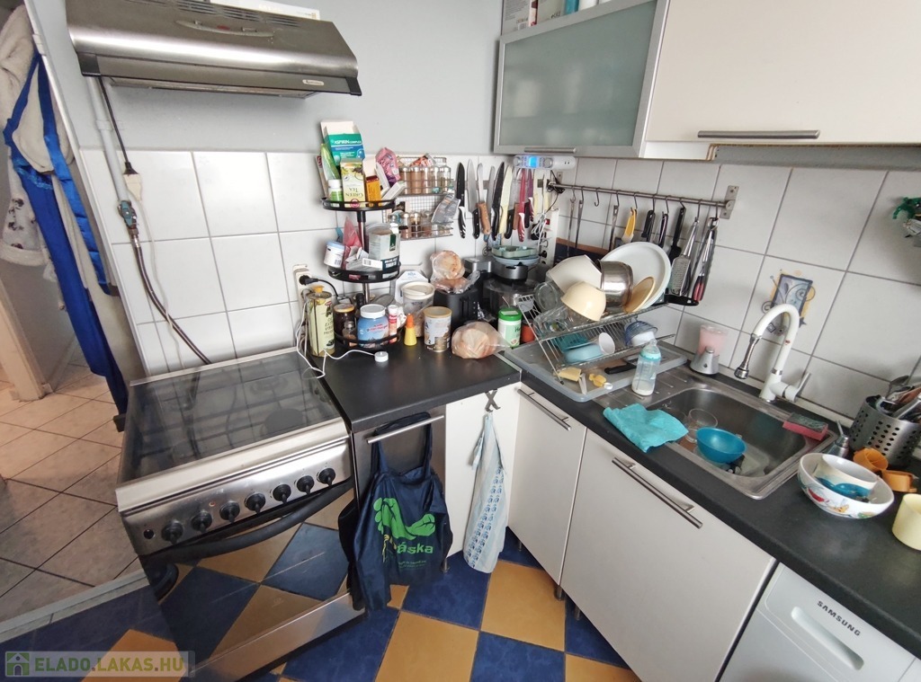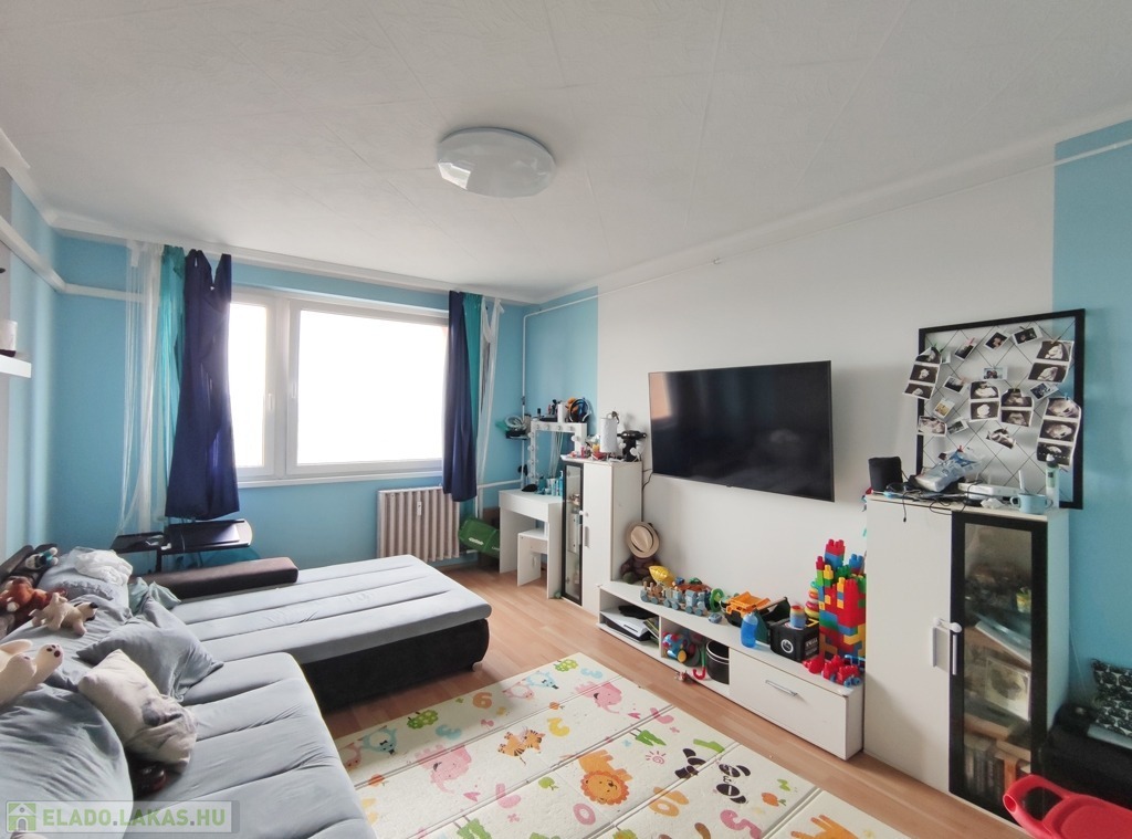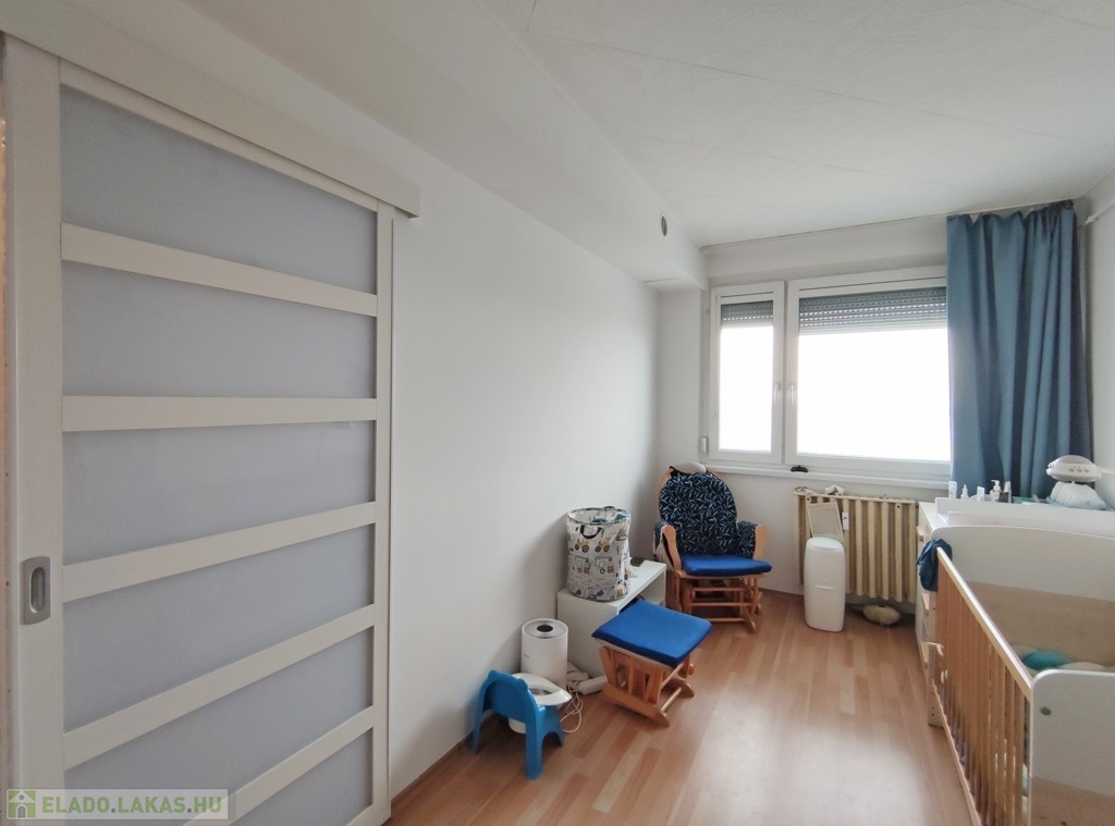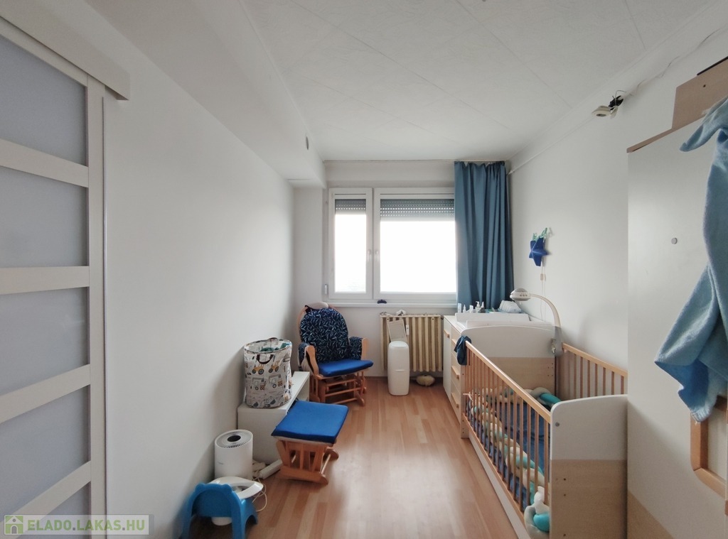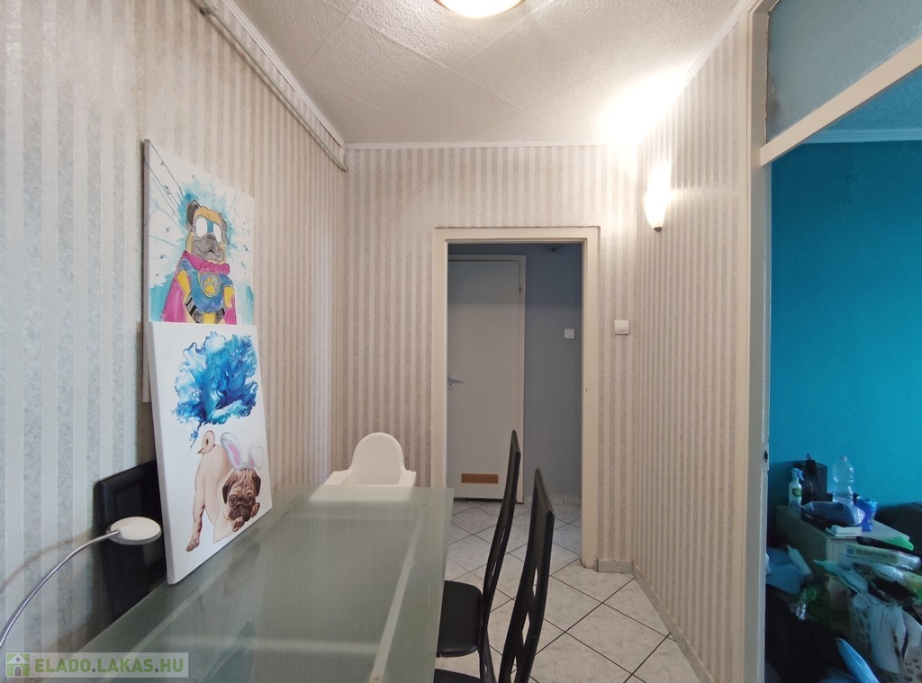 A több ponton záródó biztonsági bejárati ajtón keresztül részben felújított és karbantartott állapotú, a szobák elrendezését tekintve remek elosztású, hallos lakásba érkezünk. A bejárati ajtón belépve az előszobában közvetlenül jobb kéz felől a jó állapotú minőségi laminált parkettás, tágas, világos, panorámás, 19 nm-es, műanyag ablakos, redőnnyel szerelt nappaliba jutunk. A külön nyíló nappaliból és a közlekedőből nyíló kisebbik, minőségi laminált padlós 11 nm-es szobából is a 14 nm-es, szintén minőségi laminált parkettás, műanyag ablakos hálószobába eljuthatunk. A bejárathoz visszamenve a közlekedőben balra haladva a 2,34 nm-es, járólapos és polcos gardrób, mellette pedig a 0,8 nm-es, járólapos, polcozott kamra kapott helyet. Ezután a 2,9 nm-es kádas fürdőszobát, mellette pedig a 0,8 nm-es mellékhelyiséget találjuk. A közlekedő végében járólapos, nagyméretű műanyag ablakos, redőnyös, tágas és nagyon világos 7,6 nm-es, konyhabútorral szerelt és gépesített konyhába juthatunk el.