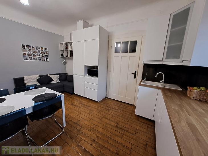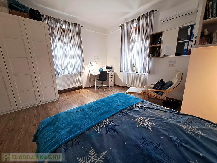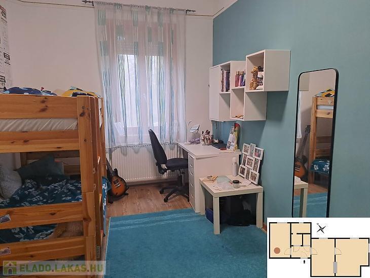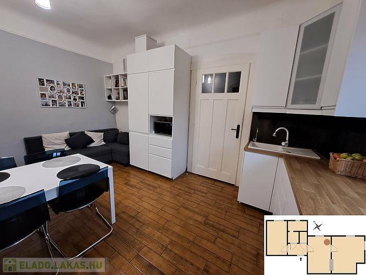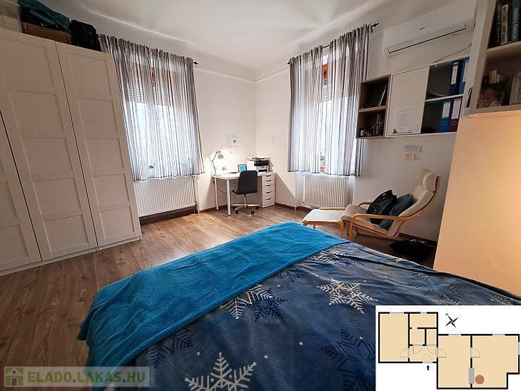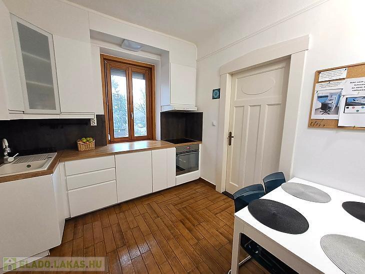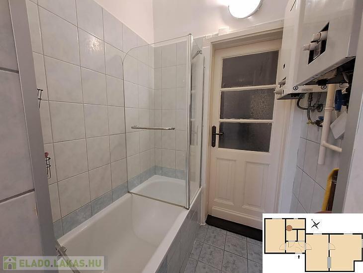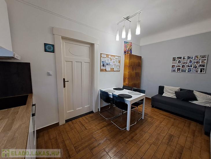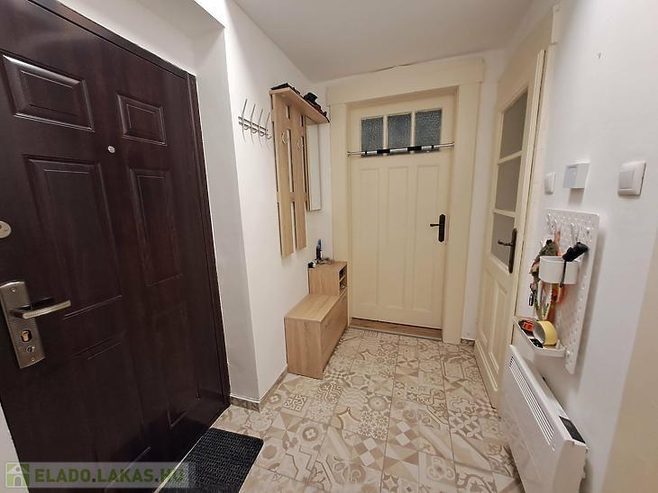 A lakásba belépve elsőként az előszobába térünk, ahonnan nyílik egy hálószoba, a kádas fürdő, külön nyíló wc és az étkezős konyha, ahonnan tovább juthatunk a nagyobb hálószobába. A lakás néhány éve részleges felújításon esett át. Új burkolat a szobákban és az előszobában, többségében ki lettek cserélve a szaniterek, új IKEA konyhabútor, konyhai gépesítés és egy konyhai víztisztító lett beépítve, ami a csapvíznél és az ásványvíznél tisztább, egészségesebb ivóvízről gondoskodik. Az elektromos hálózat felújítása már korábban megtörtént, a teljesítmény 3X16 amperre lett bővítve, amely lehetővé teszi a nagy háztartási gépek egyidejű használatát. Az ablakok modern, 3 rétegű üvegezéssel ellátott faablakok, melyeket fém redőnnyel és szúnyoghálóval szereltek fel. 2022-ben kívülről lett szigetelve a lakás. A gázkazánok javítása folyamatban van. A lakásban megőrzésre került egy cserépkályha, mely télen nem csak hangulatos, de jó meleget is képes biztosítani. A nagyobb szoba nyáron légkondicionálóval hűthető. A konyha gépesítése (mosogatógép, hűtő), a mosógép és a szárító a vételár részét képzi.