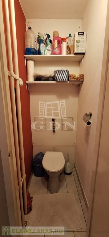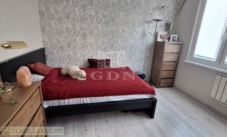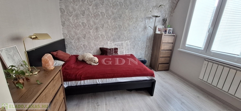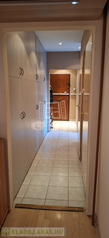 A szobák és a hall laminált parkettával, a többi helyiség járólappal burkolt. A közlekedőben végig beépített gardróbszekrény biztosít elegendő tárolóhelyet.