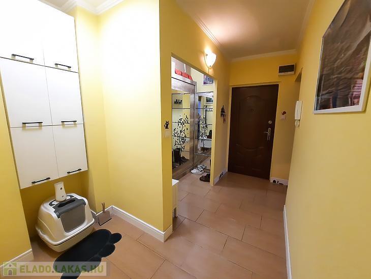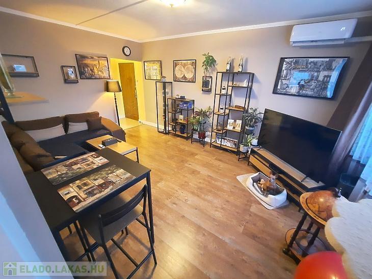 A lakás praktikus elosztású: 2+1 szoba, ablakos konyha, külön fürdő és WC, valamint két tárolóhelyiség a lakáson belül, egy gardrób és egy nyitott spejz . A burkolatok jó állapotúak, a szobákban laminált parketta, a közlekedő és a konyhában pedig járólap található. A lakásban teljes körű villamossági vezeték csere történt. A konyhabútor gépesítve a vételár részét képezi. Egyéb bútorok megbeszélés tárgyai. A bejárati és a belső ajtók cseréje megtörtént. Hűtő-fütő klíma került beszerelésre. Az ablakok régebbiek de lelettek festve.