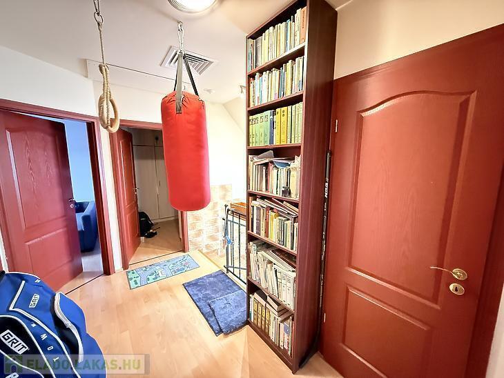 A szobák külön nyílóak, melyek laminált burkolattal rendelkeznek, a konyha és a vizes helyiségek pedig járólaposak. A lakás melegéről turbós kombi cirkó gondoskodik, egyedi méréssel. A nyílászárók az alsó szinten műanyagok a tetőtérben fából vannak és redőnnyel ellátottak. A lakás dupla komfortos alsó szinten kádas fürdőszoba található míg az emeleten zuhanyzó került beépítésre, külön mellékhelyiséggel. A beépített bútorok a vételár részét képezik.