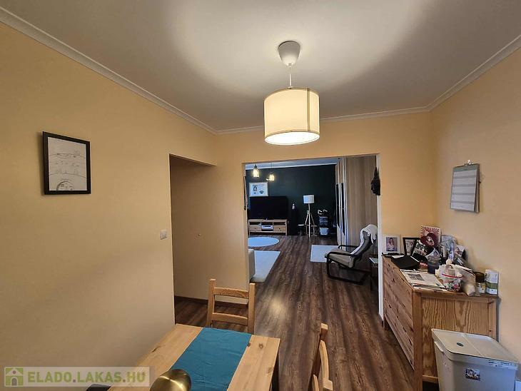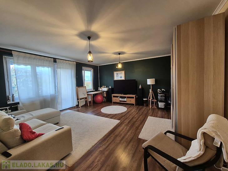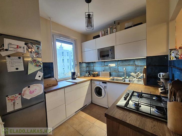 A lakás jó elosztású, világos, a szobákban jó minőségű laminált parketta található a többi helyiség járólappal burkolt. Az otthon melegéről házközponti kazán gondoskodik. A nyílászárók műanyag thermo üvegesek, redőnnyel ellátottak. A beépített bútorok a vételár részét képezik (konyhabútor gépesítve és előszobabútor). A nappaliból csatlakozik az erkély, amely szép kilátást biztosít a Budai hegyekre.