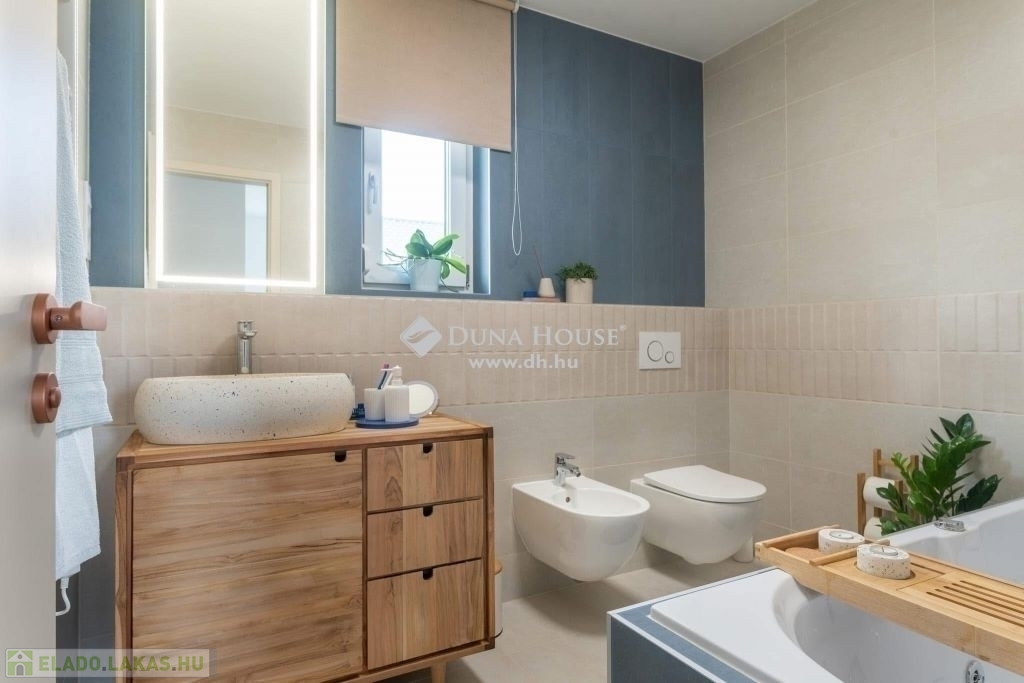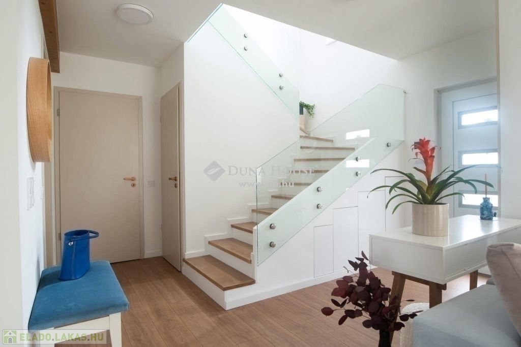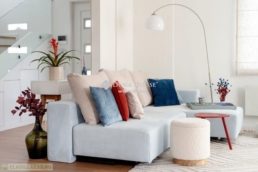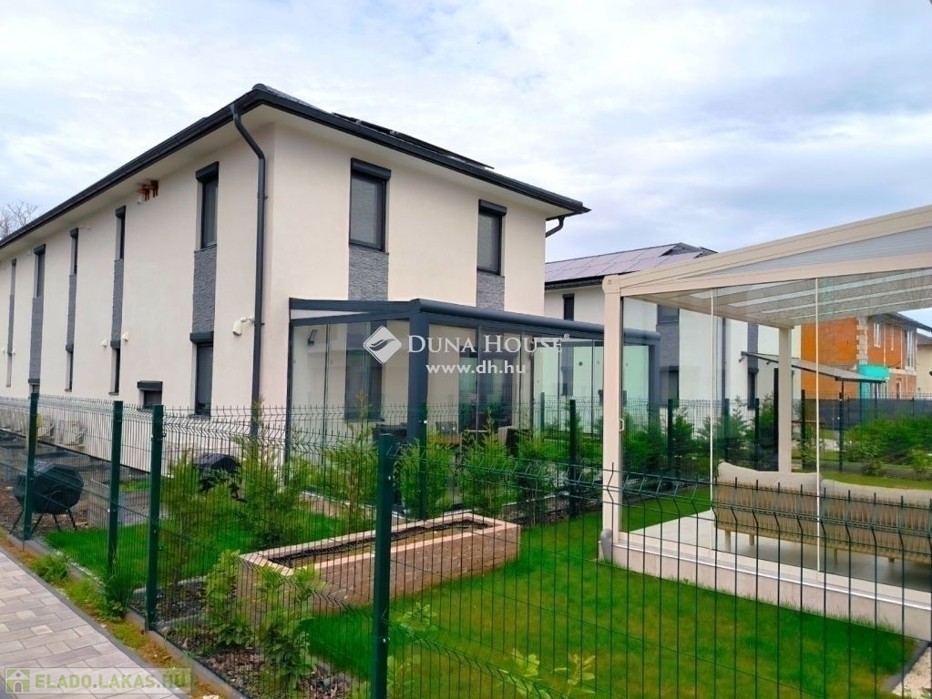 Alapterület: nettó 120 m², teraszok, garázs, tároló, kert nélkül. (Bruttó 145 nm.)Szobák száma: Nappali + 3 hálószoba két szinten.Telek mérete: ~220 m²Állapot: Új építésű.Fűtés: Elektromos (NOBO infra panel), 3 db klímaElhelyezkedés: Budapest XVII. kerület, Rákoscsaba-Újtelep, Naplás-tó közelében.Leírás:Eladó Budapest XVII. kerületének egyik legkedveltebb kertvárosi részén, Rákoscsaba-Újtelepen egy modern, új építésű ingatlan. A Naplás-tó közelsége, a csendes környék és a magas műszaki tartalom teszi igazán különlegessé ezt az ingatlant.Az otthon nappaliból, 3 külön nyíló hálószobából, teraszból és közvetlen kertkapcsolatból áll, mely ideális választás lehet:- fiatal pároknak családalapításhoz,- több gyermekes családoknak,- nyugodt életre vágyó idősebbeknek.Felszereltség, extrák az árban:- Kiépített és beüzemelt napelem rendszer- Norvég NOBO elektromos fűtőpanelek- 3 db hűtő-fűtő klímaberendezés- Teljes értékű riasztórendszer- Kamerás kaputelefon- Motoros garázskapu és kertkapu, távirányítással- Automata öntözőrendszer + füvesített kert- Automata külső világítás- Fedett garázs- Burkolatok és szaniterek még választhatók!Elhelyezkedés, közlekedés:A ház Rákoscsaba-Újtelep csendes utcájában található, a Naplás-tó szomszédságában, családbarát környezetben.- Rákoscsaba-Újtelep vasútállomás – Keleti pályaudvar kb. 19 perc.176E: Örs vezér tere M+H és Rákoscsaba-Újtelep Tóalmás utca között közlekedik, összekötve a városrészt a metróhálózattal.98-as busz: Kőbánya-Kispest M és Rákoscsaba vasútállomás között jár, biztosítva a kapcsolatot a metróval és más városrészekkel.275-ös busz: Rákoscsaba vasútállomás és Piski utca (óvoda) között közlekedik, kiszolgálva a helyi igényeket.297-es busz: Rákoscsaba-Újtelep vasútállomás és Nyeremény utca között jár, segítve a helyi közlekedést.908-as éjszakai busz: Móricz Zsigmond körtér M és Rákoscsaba-Újtelep Tóalmás utca között közlekedik, biztosítva az éjszakai elérhetőséget.