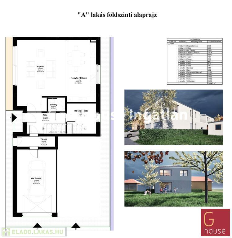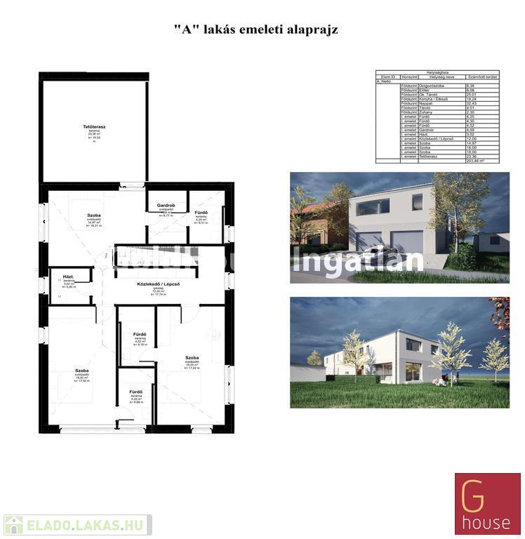 Az „A” lakás 191,78 m² nettó alapterületű, négy szobás, négy fürdőszobás, 196,16 m² kerttel, 23,36 m² emeleti terasszal és garázzsal, ára 193.200.000 Ft.