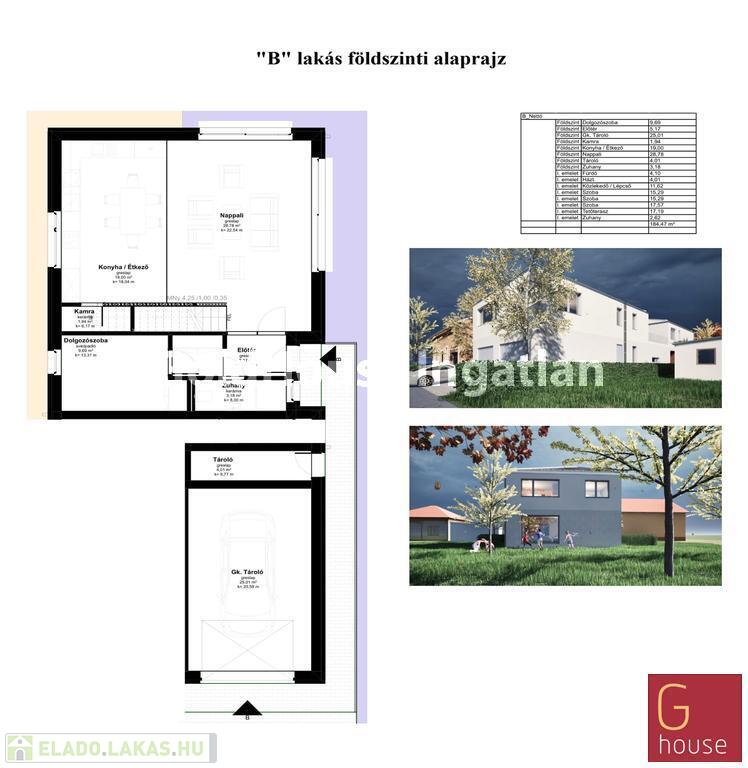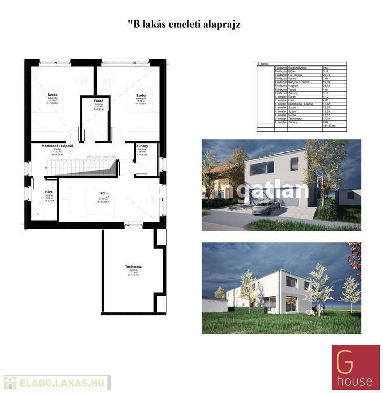 A „B” lakás 175,8 m² nettó alapterületű, négy szobás, három fürdőszobás (igény esetén plusz egy fürdő kialakítható), 190 m² kerttel, 17,19 m² emeleti terasszal és garázzsal, ára 184.900.000 Ft.