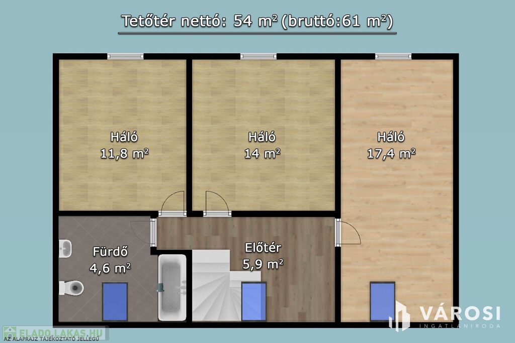 TETŐTÉR: egy masszív fém lépcsőn juthatunk fel. A tetőtér extra világos, hasznos területe 54 m2, ott pedig 3 db hálószoba, egy kádas fürdőszoba, és egy kis előtér található.