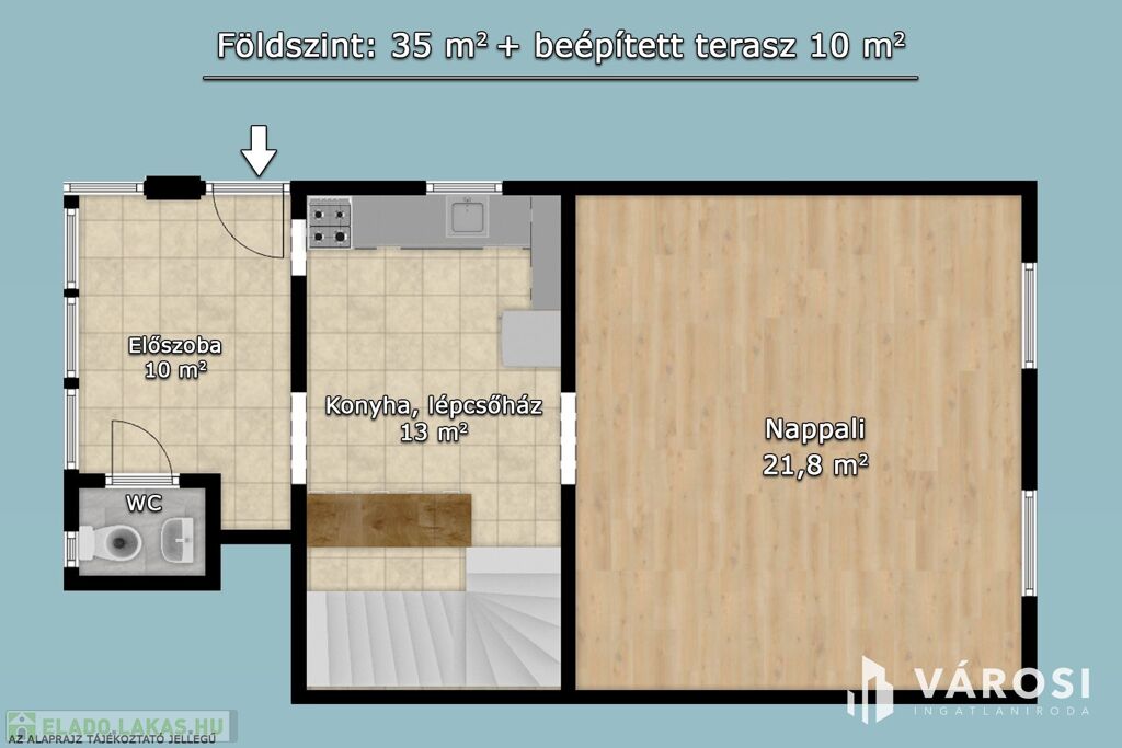 FÖLDSZINT: a lakás egy beépített teraszról közelíthető meg, ami jelenleg egy tágas előszobaként funkcionál, innen nyílik a WC, konyha és a nappali.