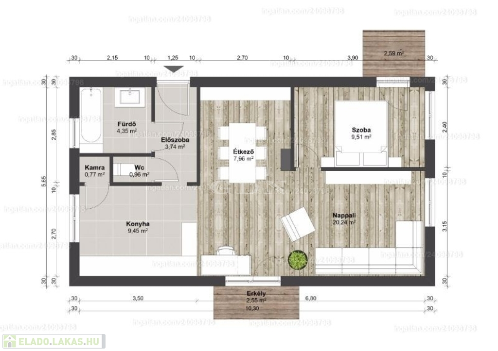 A lakáshoz tartozik egy 3 nm-es erkély is, ami kellemes kinti pihenőhelyként szolgálhat.