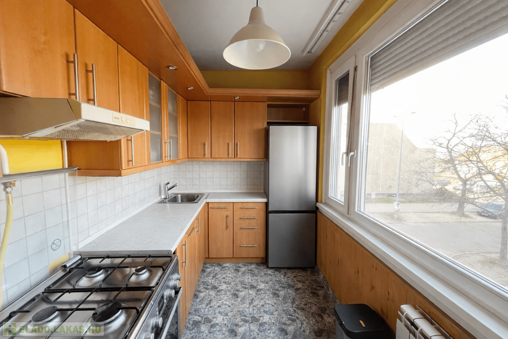 A nyílászárók mindenütt műanyagra cseréltek, a konyha kifejezetten világos, nagy ablakkal.