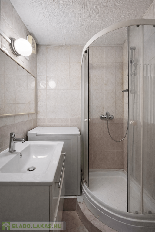 A fürdőszoba zuhanyzós kialakítású, a WC külön helyiségben található, a vízfogyasztás 2 db vízórával mérhető.