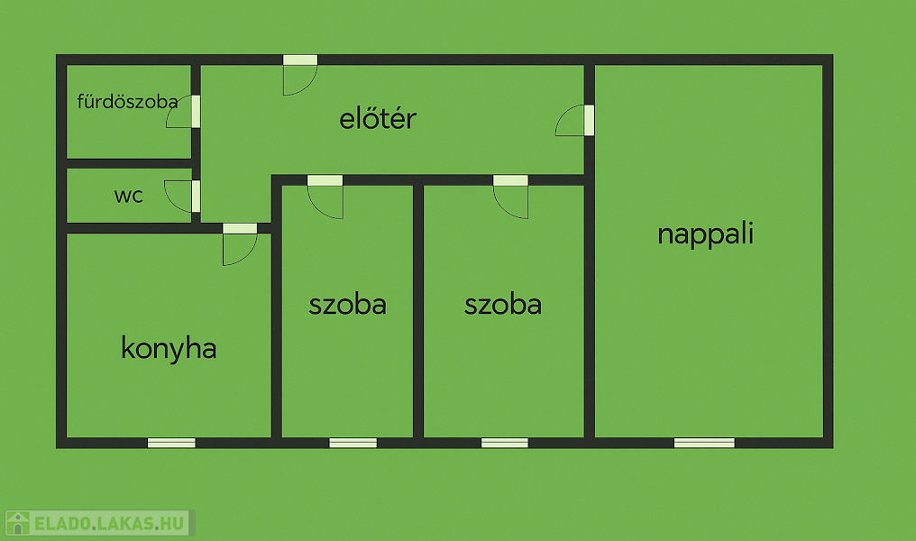 Elrendezés: előtér, két kisebb szoba egymással párhuzamosan, tágas nappali, konyha, fürdőszoba és külön WC.