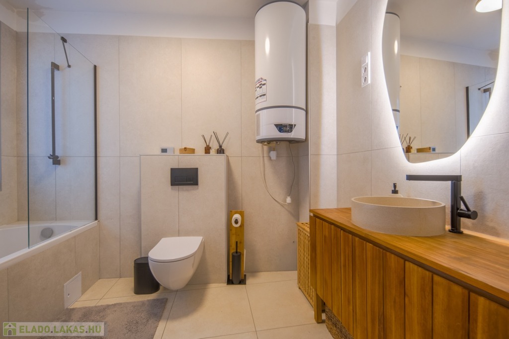 A 7 m2-es fürdőszoba kádas, ablakos, a WC-vel egy helyiségben, a konyhabútor teljesen egyedi építésű, beépített gépekkel együtt az ár részét képezi.