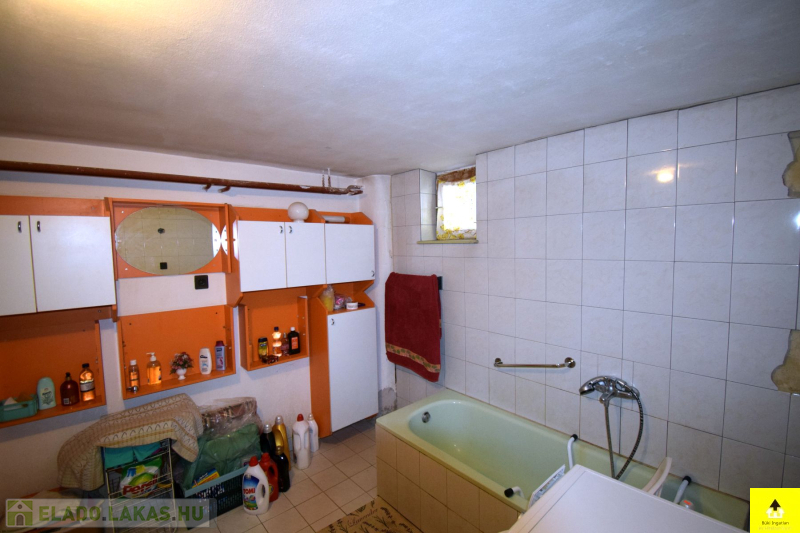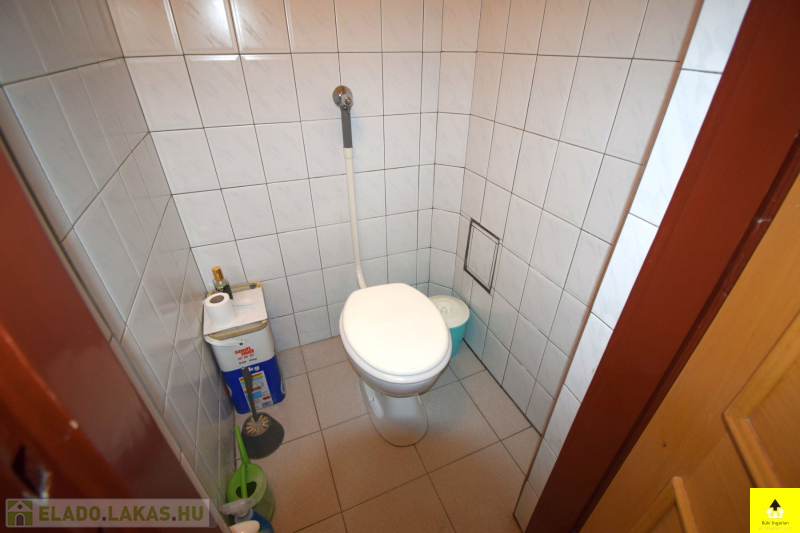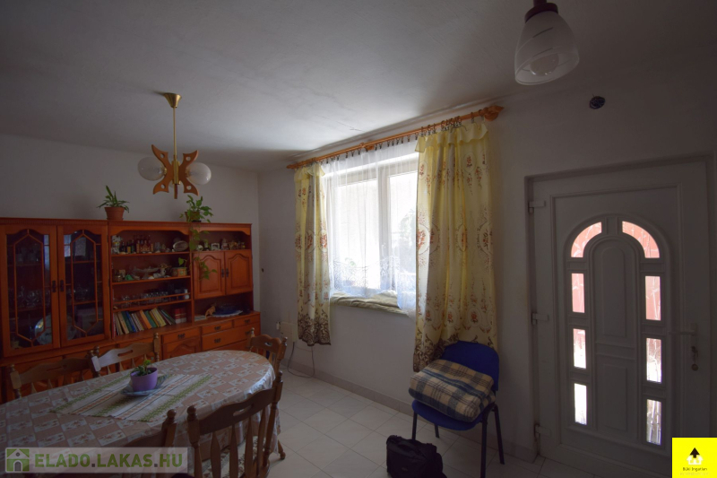 •A földszinti részén (ami inkább magasföldszint) található egy tágas konyha étkezővel, 3 szoba, egy közlekedő, egy kamra egy fürdőszoba és egy wc, valamint a bejáratnál egy félig fedett terasz.