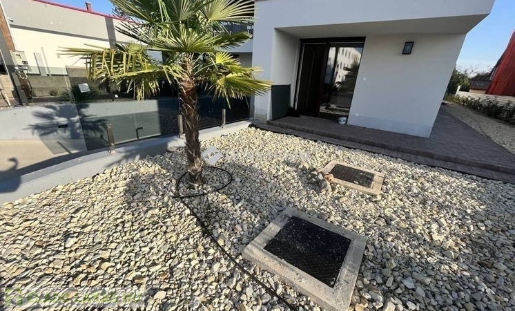 A modern társas ház földszintjén található, nagy terasszal, részben bútorozva, így azonnal költözhető.