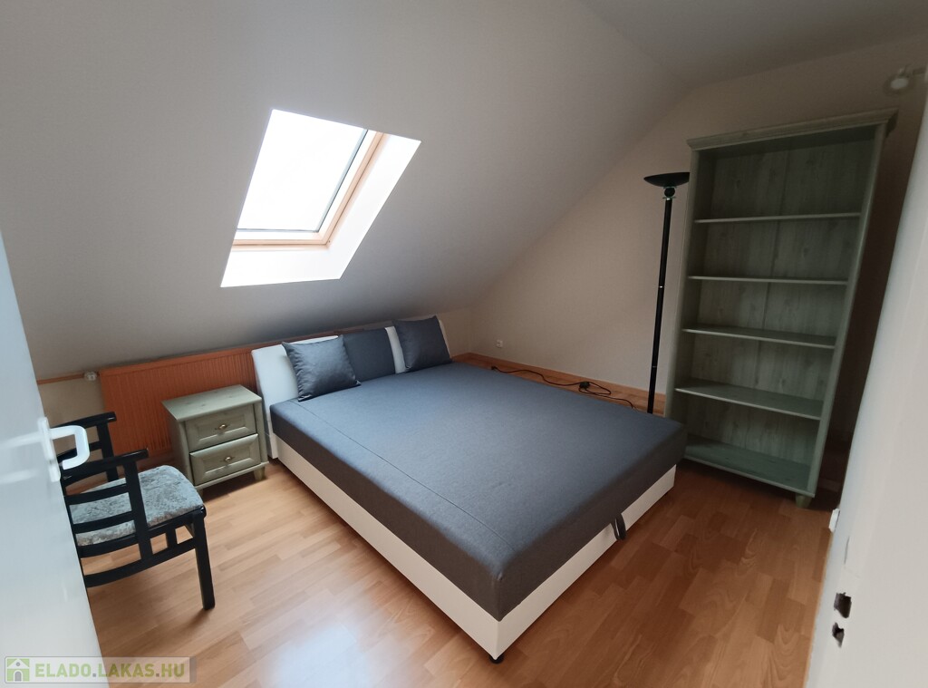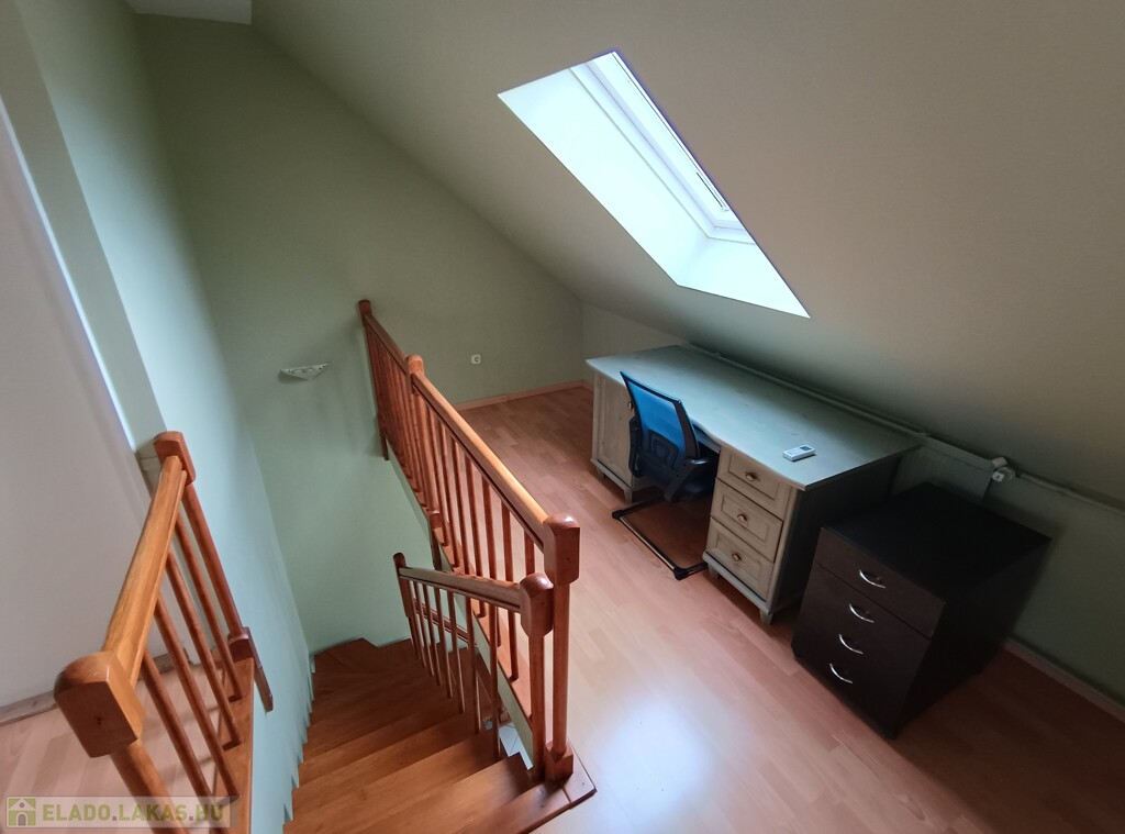 - Felső szint, (tetőtér) helyiségei: előtér, két hálószoba, WC kismosdóval.