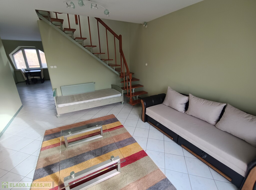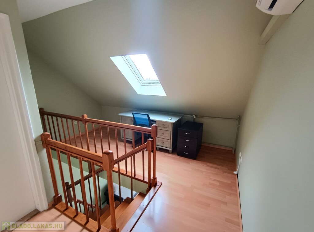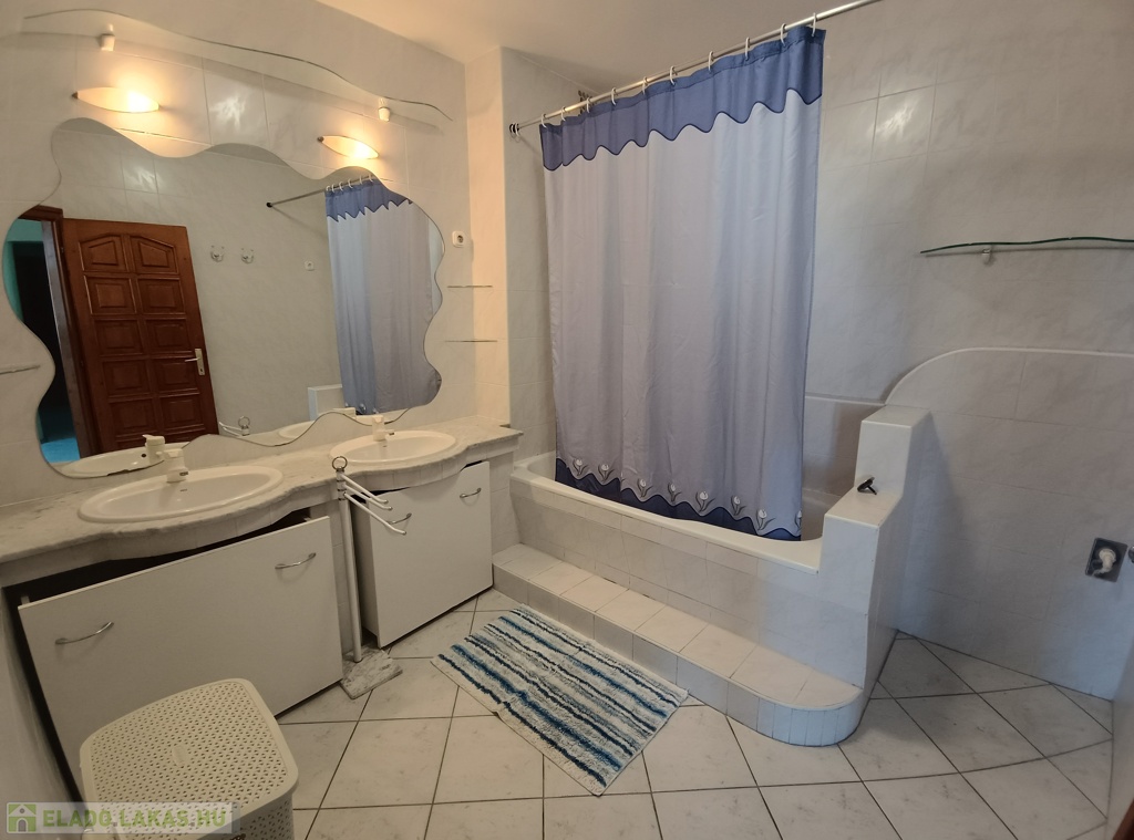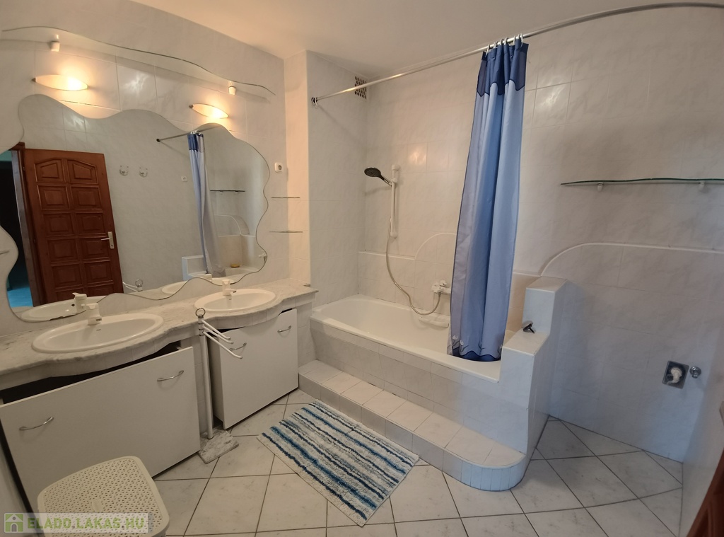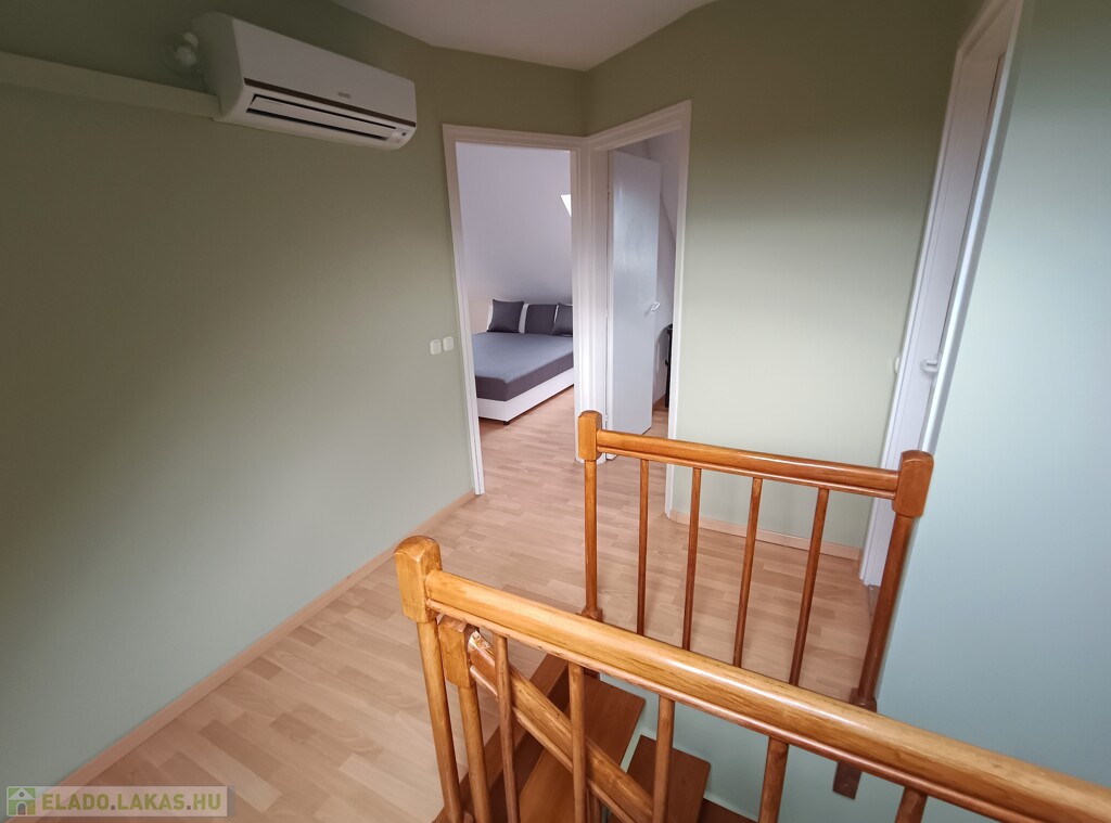 - Alsó szint helyiségei: előszoba, konyha, nagyméretű étkező + bár, nappali, kétmosdós nagy fürdőszoba, WC külön, erkély.