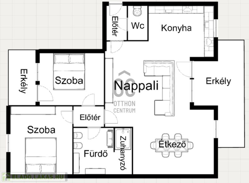 A lakás helyiségei : 43 m2 - es klímás konyha - étkező - nappali egy légtérben, közvetlen terasz kapcsolattal, 2 db szoba , az egyik klímás + terasz kapcsolatos, tágas fürdőszoba épített zuhanyzóval, wc - vel, külön vendég wc , és az előtér.