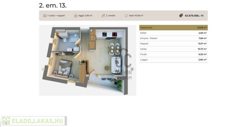 Ez a 2. emeleti lakás 40,68 nm-es, nappali-étkező-konyha +1 szobás, 3,8nm-es loggával.