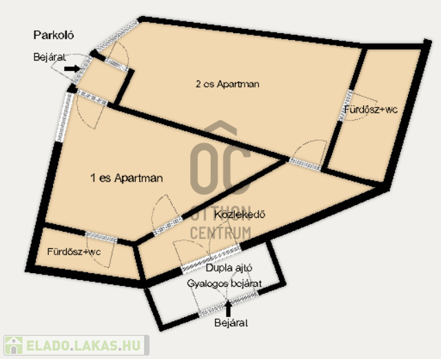 - az apartmanoknak 2 bejárata van, hátsó bejárat közvetlenül egy gépkocsiparkolóból közelíthető meg, egy közös előszobába érkezve nyílnak a szobák külön