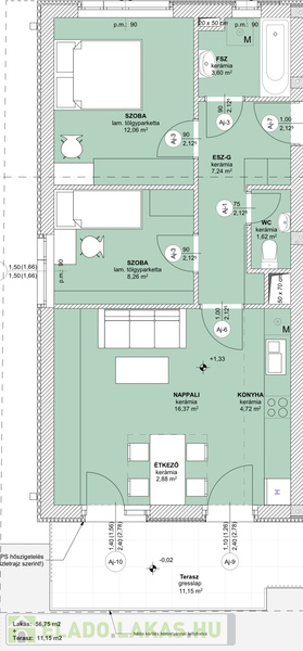 (Konyhában munkapult feletti 60 cm sáv, teljes hosszban. Fürdõszoba, toalett, közlekedõ, nappali- konyha teljes burkolását az ár tartalmazza)