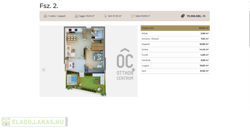 Ez a földszinti kertkapcsolatos lakás 50 nm-es, nappali-étkező-konyha +1 szobás, 10,6 nm-es terasszal és 32 nm-es kerttel.