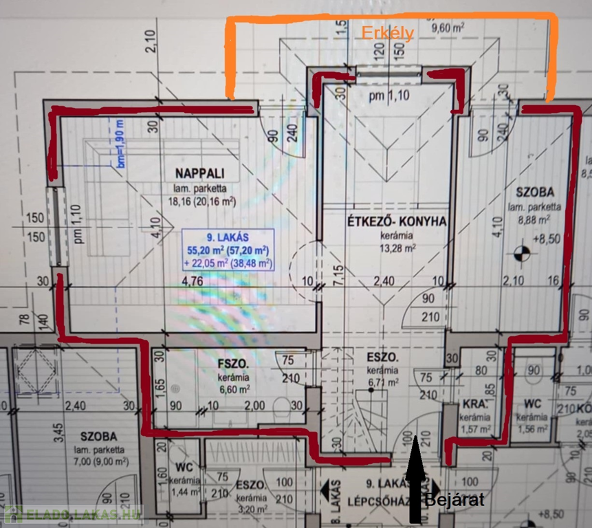 - A felső szobák, és az előszoba padlózata laminált parketta, a többi helyiség csempével burkolt.