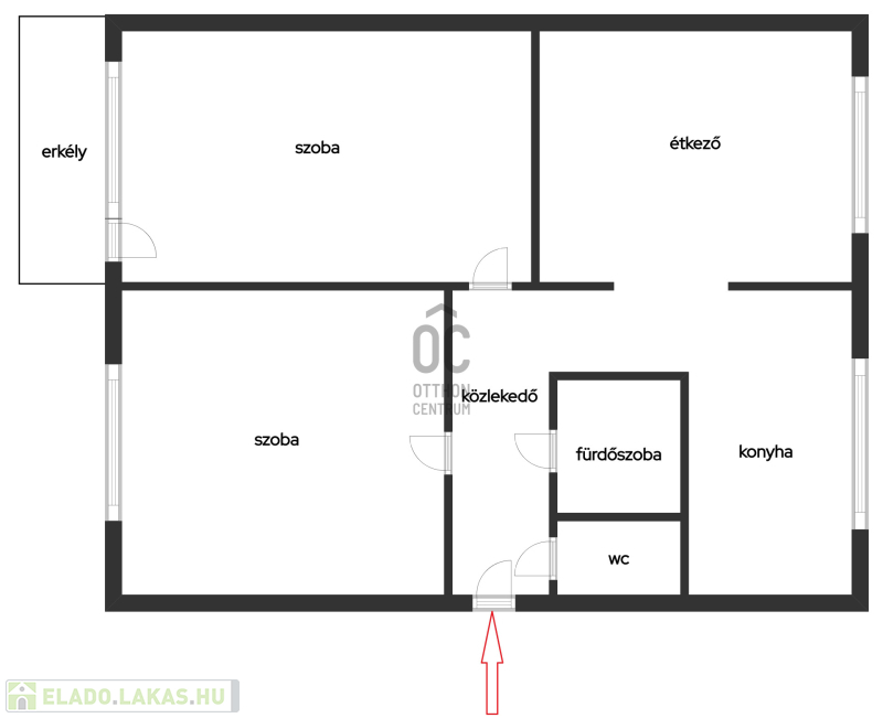 Konyha + étkező, 2 szoba, fürdőszoba, WC, előszoba elosztású