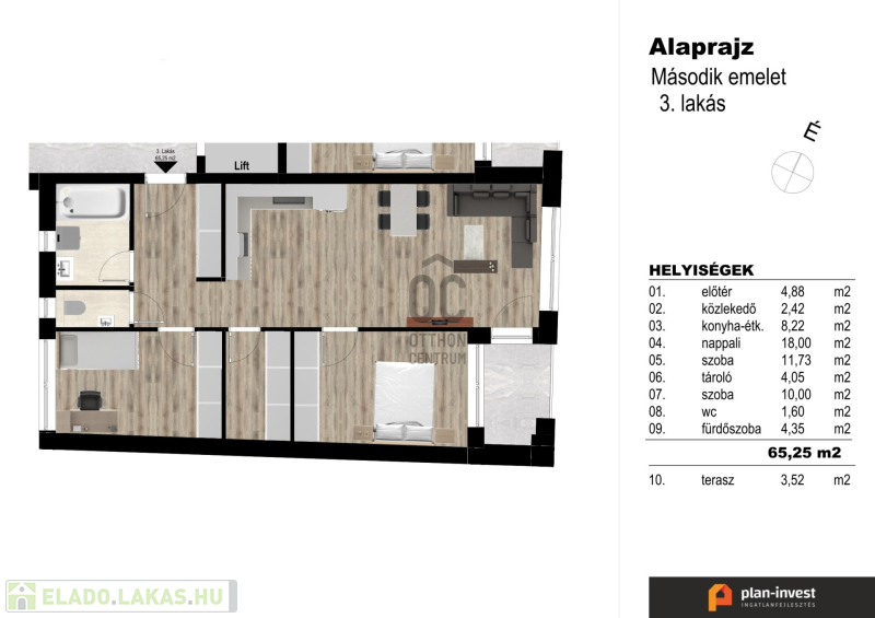 65 m2 alapterületű + 4 m2 erkély tartozik hozzá.