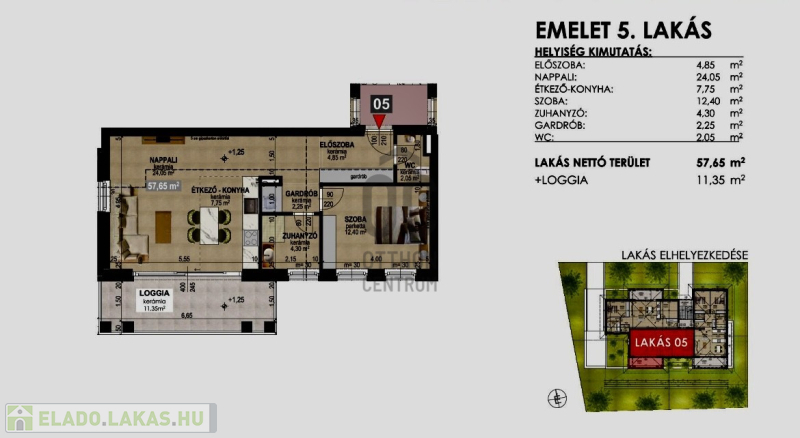 Emelet 5 lakás: 57.65 nm + 11.35 nm loggia