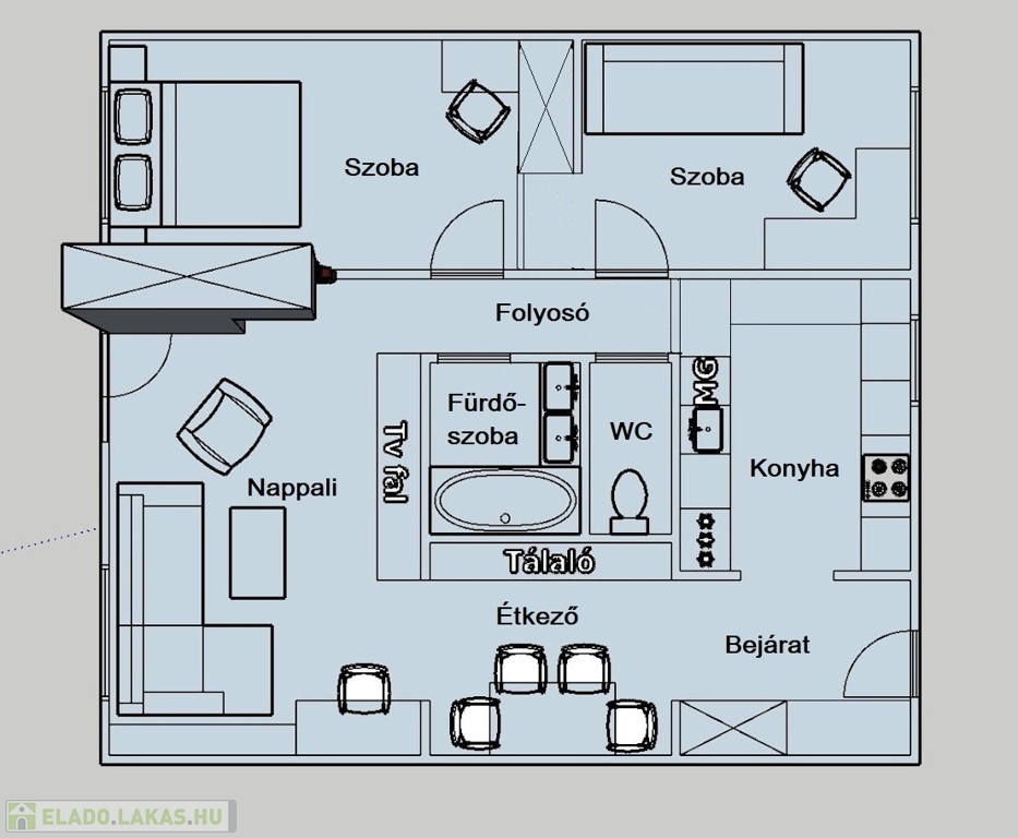 • Elrendezés: nappali + 2 külön nyíló szoba