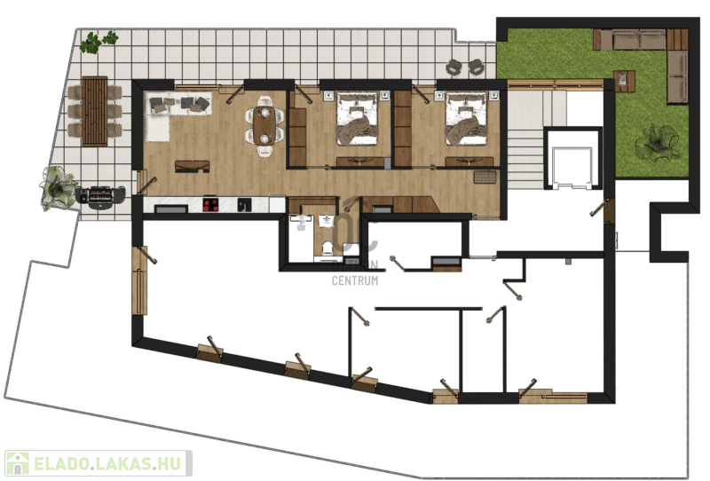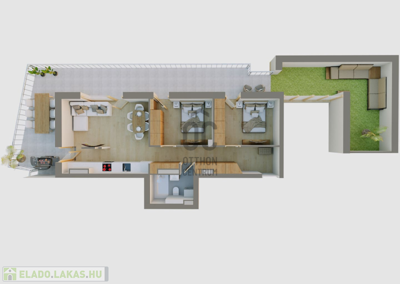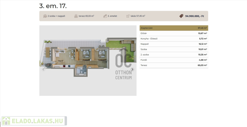 Ez a 3 emeleti penthouse lakás 57,45 nm-es, nappali-étkező-konyha +2 szobás, 65 nm-es tetőterasszal és 32 nm-es.