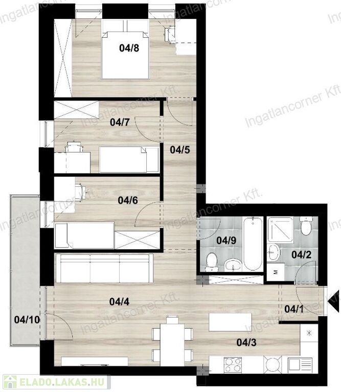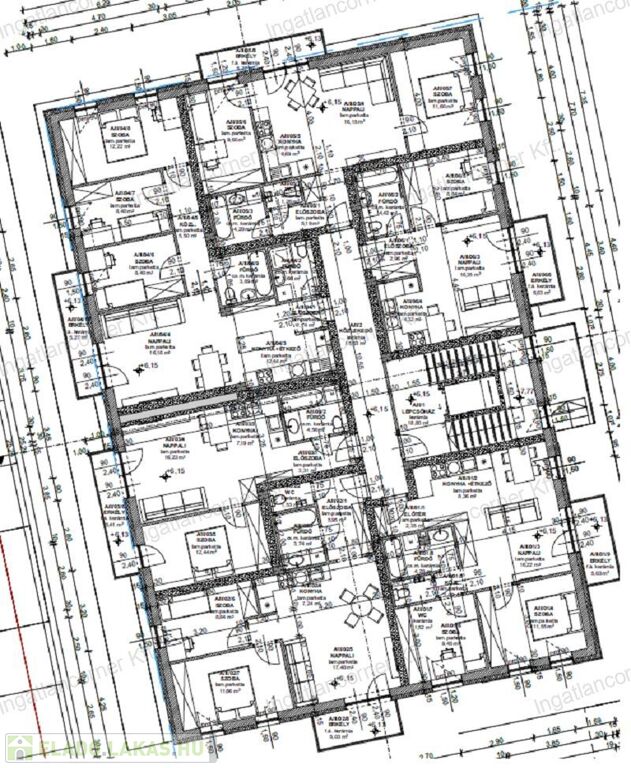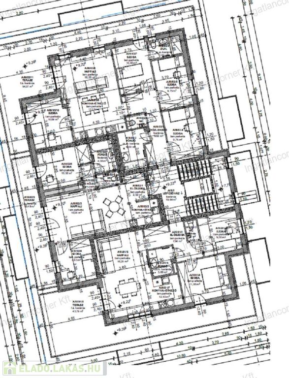 - 90 nm-es lakás: közlekedő, nappali-konyha-étkező, fürdő, wc, zuhanyzó, három 10 és egy 11 nm-es szoba, valamint 54 nm-es terasz.