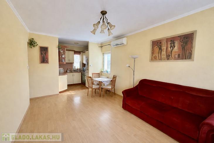 Elosztása praktikus: amerikai konyhás nappalival, 1 külön nyíló hálószobával, valamint fürdőszobával és WC-vel került kialakításra. A fűtést turbó kombi cirkó biztosítja, a nyári nagy melegben pedig egy hűtő–fűtő klíma gondoskodik a kellemes komfortérzetről.