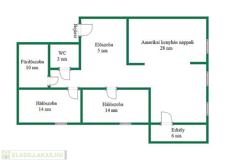 Az elrendezés ideális: Amerikai konyhás nappali + 2 hálószoba, fürdőszoba, külön nyíló WC, és egy előszoba biztosít kényelmes életteret.