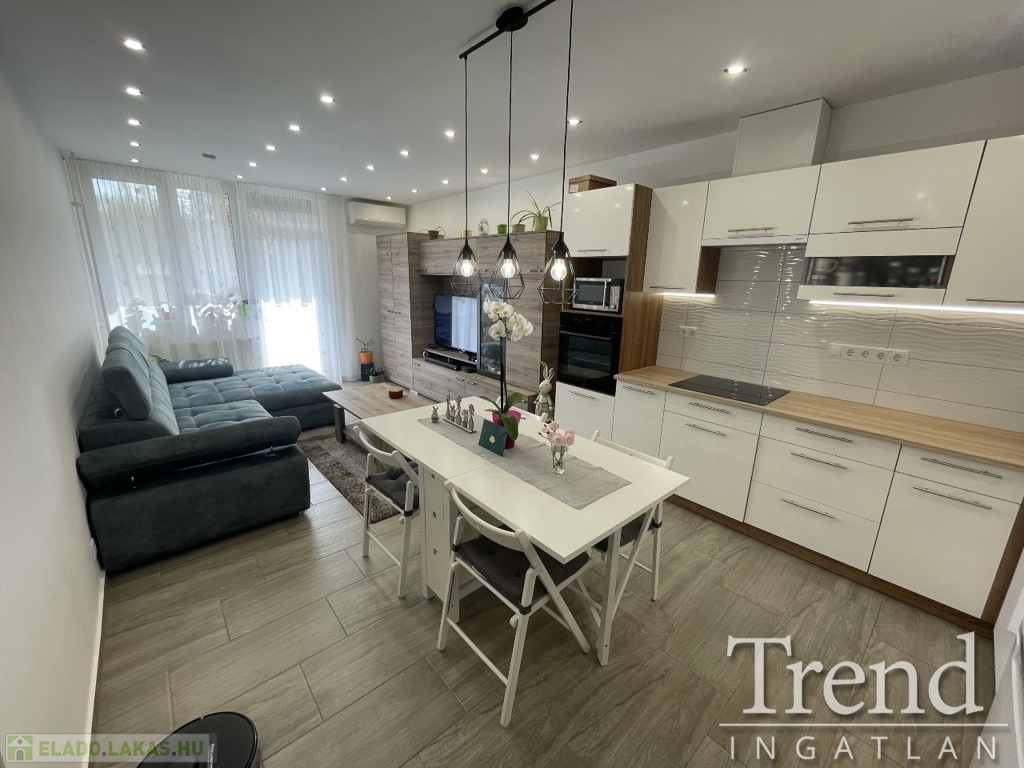 Előszoba, közlekedő folyosó, nappali + konyha, fürdőszoba járólapozva, szobák laminált lapozva. Összes nyílászáró három rétegűre cserélve, melyek redőnyözve, szúnyoghálóval szerelve vannak, illetve a bejárati ajtó is több ponton záródó. A felújítás során a teljes gépészet villamos hálózat (32A-re bővítve), vízvezeték cserélve lett, a gáz hálózat ki lett kötve, a vízellátás energiatakarékos villany bojleren keresztül működik. A lakás átépítésekor a konyha be került a nagy szobába, így a nappali konyha egy légtérben van! A konyha teljesen felszerelt, elektromos sütő, főzőlap, szagelszívó került beépítésre. A lakásban végig álmennyezet lett kialakítva energiatakarékos spot égőkkel, valamint riasztó rendszer került kiépítésre.