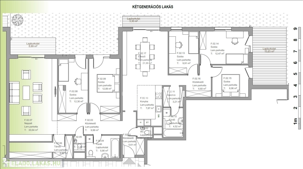 -F.02 lakás 164,3 m2; terasz: 32,85 m2; kert: 168,36 ár: 214.060.000Ft.