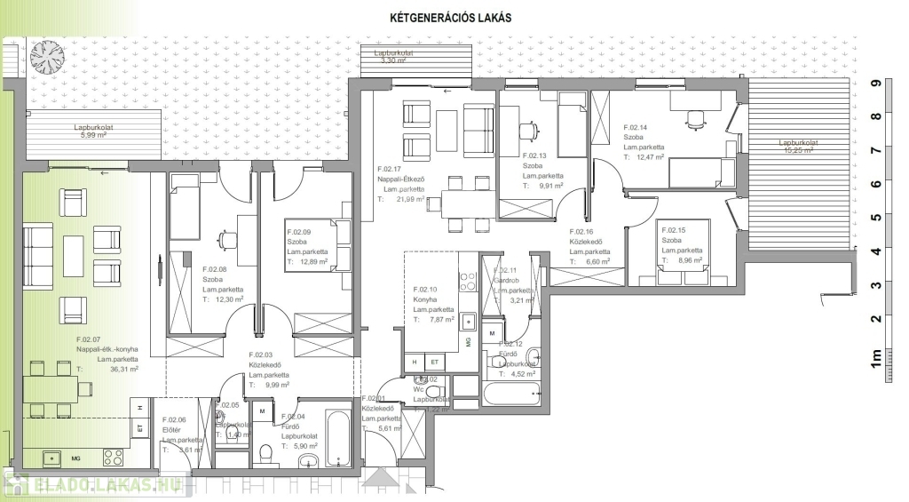-F.02 lakás 164,3 m2; terasz: 32,85 m2; kert: 168,36 ár: 248.000.000,-Ft.
