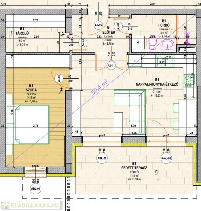 (változtatható)A nappali és a hálószobák laminált parketta padlóburkolattal, az egyéb helyiségek hálósan rakott mázas kerámialap padlóburkolattal készülnek. A WC-k és fürdőszobák falain 2,20 m magasságig, a konyhákban a tervezett beépítésnek megfelelően az alsó és felső elemek közti 60 cm magasságú sávban készül (mindenhol hálós formációban rakva) csempeburkolat. Az alábbi m2 anyag áru burkolatokat tartalmazza a lakás vételára: