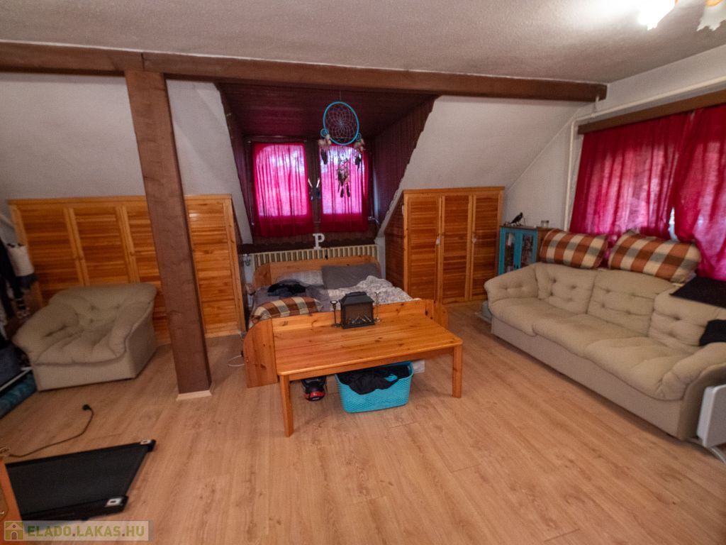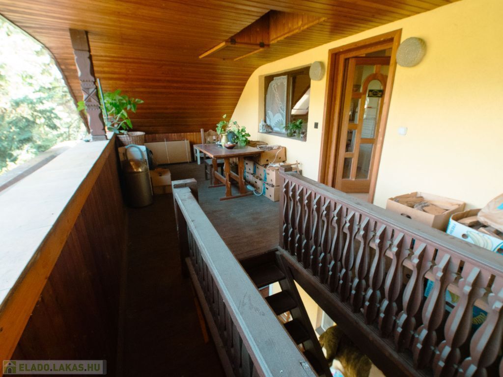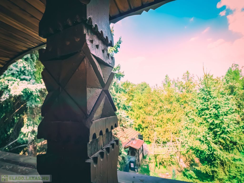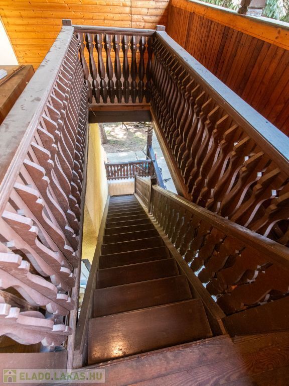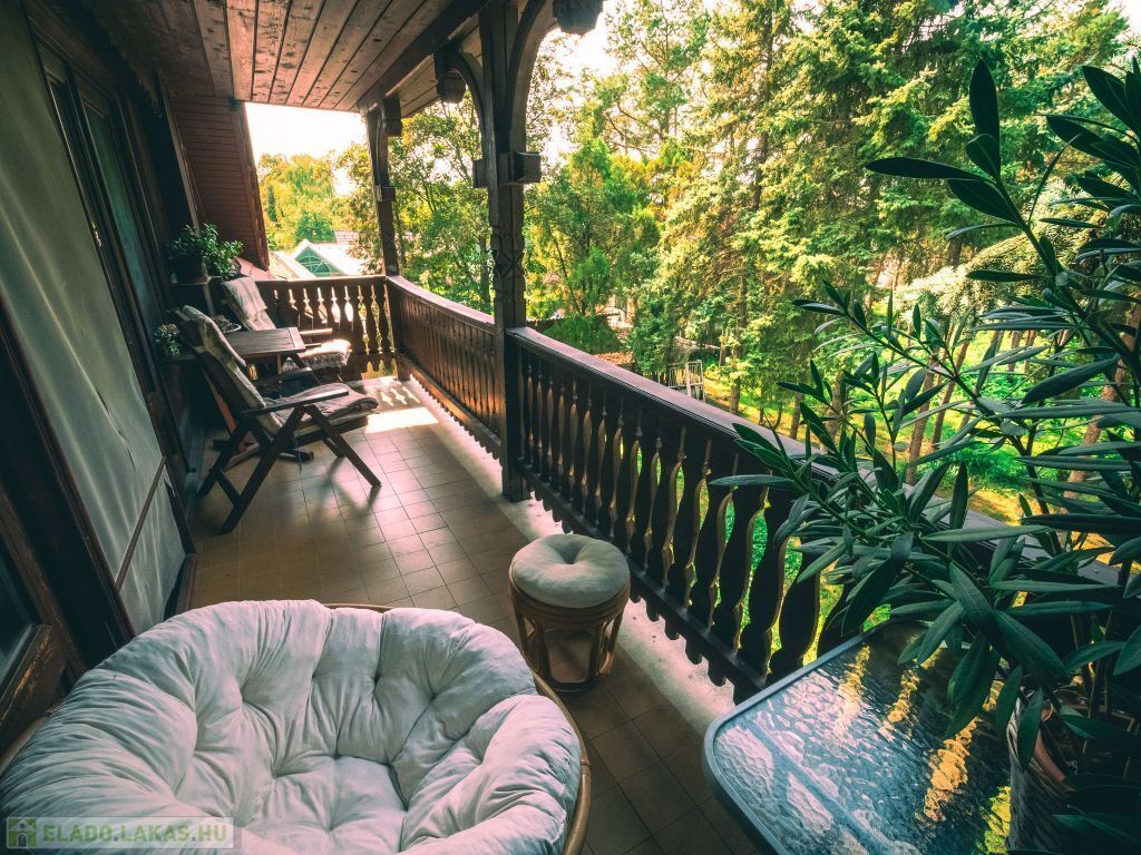 Az 1930-as években épült villaépület egy hangulatos, gondozott 2200 nm-es saroktelken található. A telekre két székelykapun keresztül jutunk be, a gépkocsik számára készült kapu távirányításos! A fákkal körbevett ház kívülről eredeti formáját megőrizte, belül viszont három önálló lakásra osztott. Ez az ingatlan a legkisebb a három lakásból, és a tetőtér kétharmadát foglalja el. A villa tetőzetét, teraszait, és lépcsőit gyönyörű famunka teszi egyedivé és kortalanná, az egész házat belengi egy erdélyi vadászház hangulata! Ebbe a lakásba egy szépen faragott falépcsőn jutunk fel, pontosabban a nyitott előtérbe és majd onnan a lakásba. A konyhából nyílik az egyik hálószoba és a folyosó, melyről nyílnak a fürdők, a másik hálószoba, és a több mint 50 nm-es nappali! Ennek erkélyéről gyönyörködhetünk a szomszéd telek ősfás fenyvesében, mely lenyúlik a Duna-partig (és szintén megvásárolható!)!
