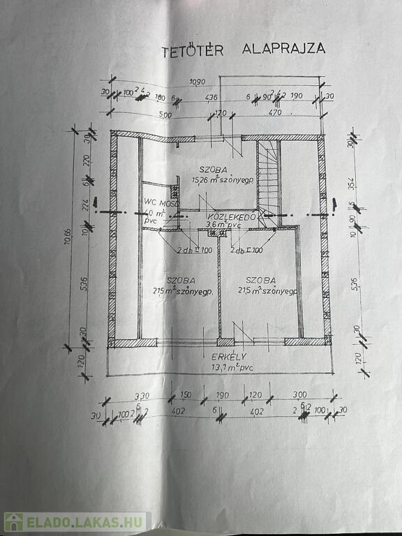 Tetőtér: 3 szoba, zuhanyzós fürdőszoba + mellékhelyiség, erkély.