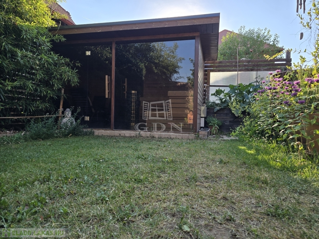 A 80 m2-es kertben kialakított kis magaságyásokban hobbikertészkedéssel lehet kikapcsolni a munkanapok után. A kert ékköve a mészkőből faragott kerti kút és a 6 méter magas fekete bambusz sor mellett, egy 6 személyes, egyedi tervezésű elektromos finn, csomómentes, rezgőnyár szauna hozzá tartozó hidegvizes merülő dézsával. A hűvösebb hónapok komfort élményét egy erdélyi fatüzelésű dézsa is fokozza.