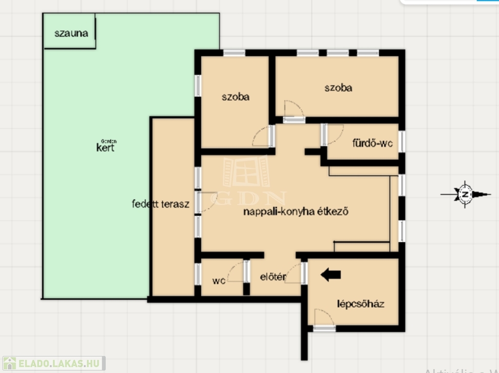 előtér - mosdó-wc - konyha-étkező-nappali-fedett terasz - előtér - fürdő-wc - szoba - szoba - kert- szaunaház