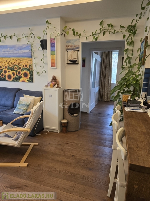 A szobákban, a konyhában és a nappaliban eredeti svéd tölgyfa padló, az előtérben és a fürdőben gyönyörű kerámia burkolatú a padozat. Az amerikai konyhás nappaliban fa konyhabútorok egyedi tervezésűek, tömör tölgyfa munkalappal, beépített elektromos elektromos sütővel, gáz főzőlappal, elektromos páraelszívóval, és mosogatógéppel valamint elektromos szelektív kukával.
