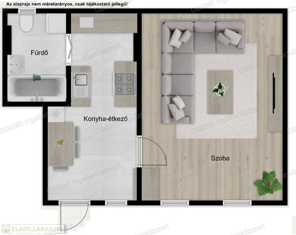 A 36nm-es lakásban konyha-étkező, egy szoba és egy kádas fürdőszoba lett kialakítva, ill. az udvar hátsó felében külön tároló is tartozik hozzá.
