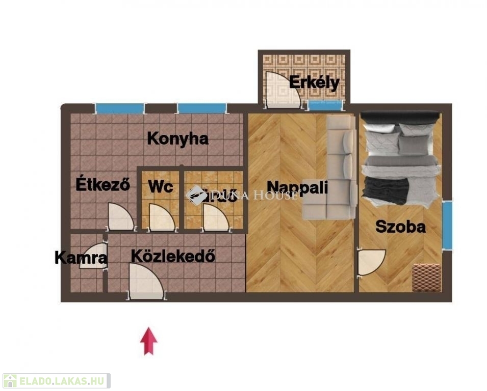 Kialakítása: tágas nappali, szoba, közlekedő, kamra, külön wc, fürdő, étkező, konyha, erkély.