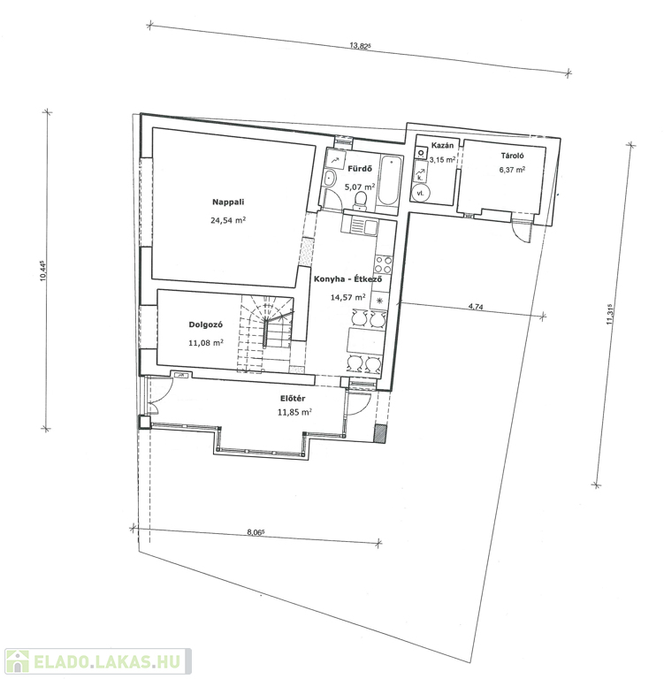 Elrendezése: tágas-, napfényes előszoba, nappali +konyha, 3 szoba, 2 fürdőszoba