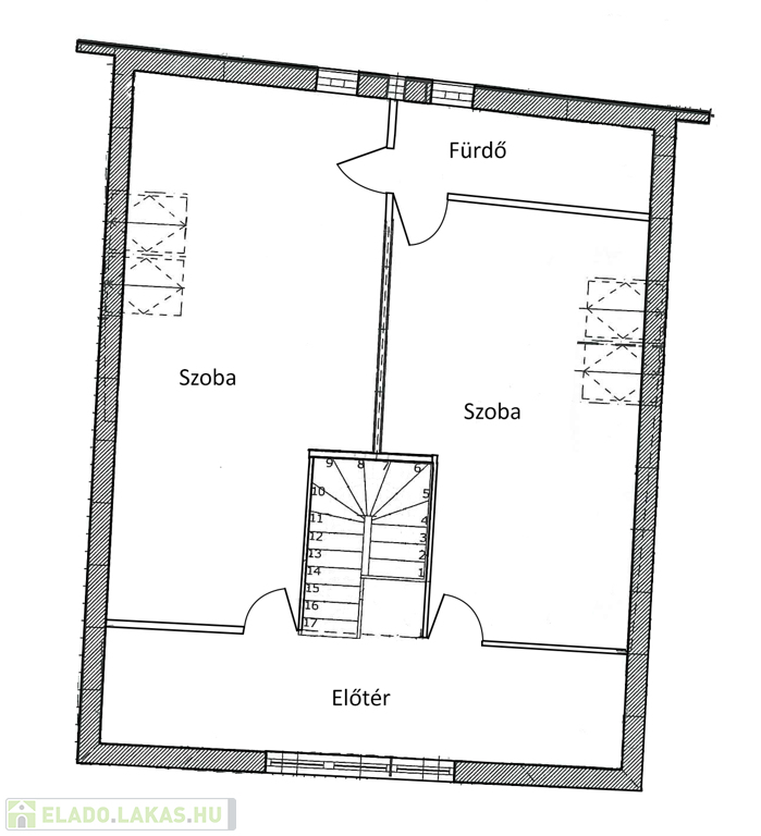 Legfelül padlás és az udvar felől külön helyiségben kazánház-tároló.