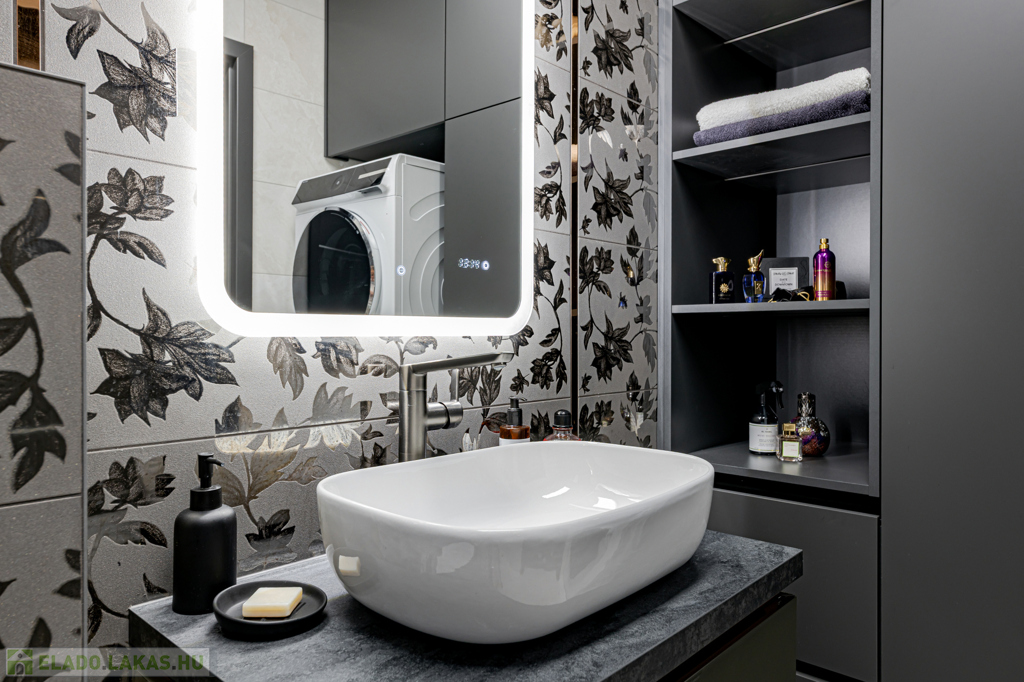 A fürdőszobában a kiállások megvannak a zuhanykabinhoz, a csaptelepekhez, a lefolyóhoz, melyeket a beépített szekrény eltakar. Igény szerint kivehető és mindenféle rombolás nélkül kialakítható a zuhany.