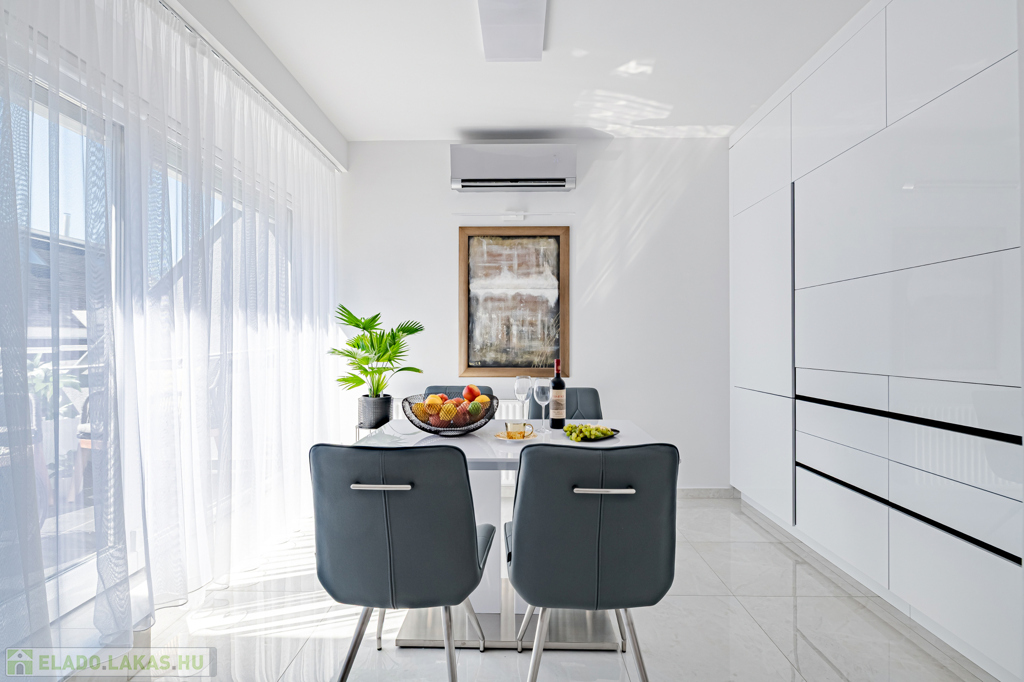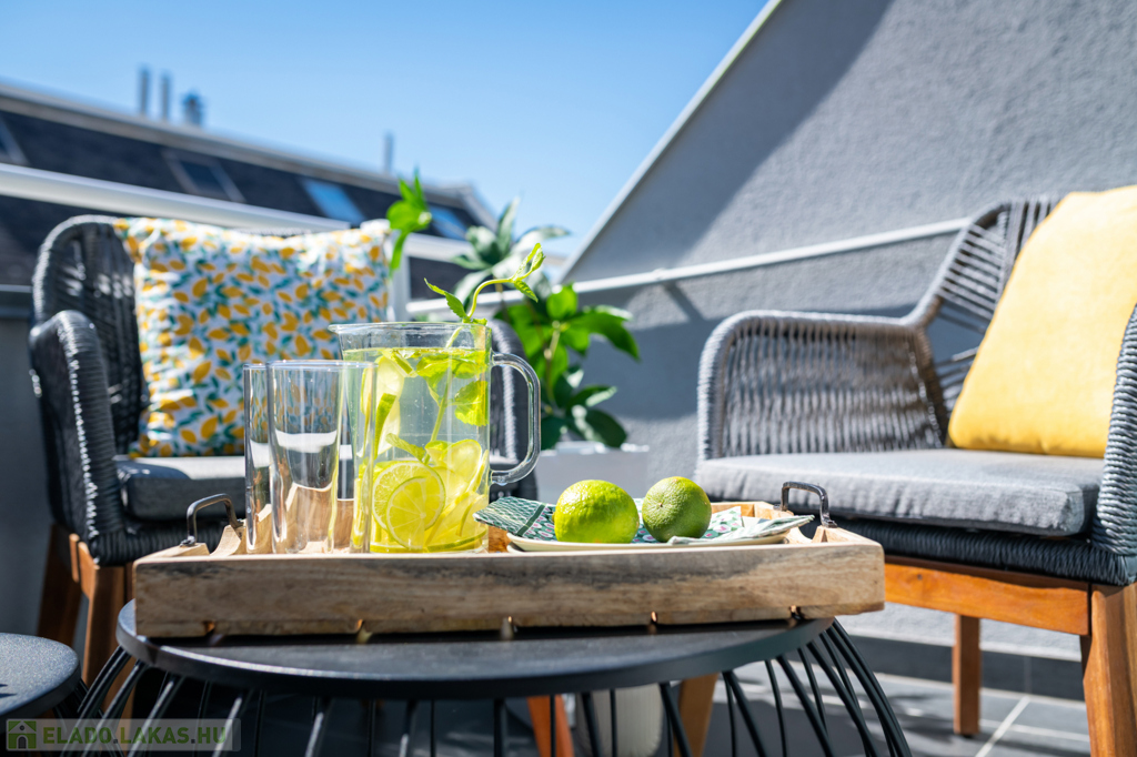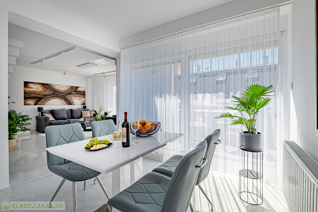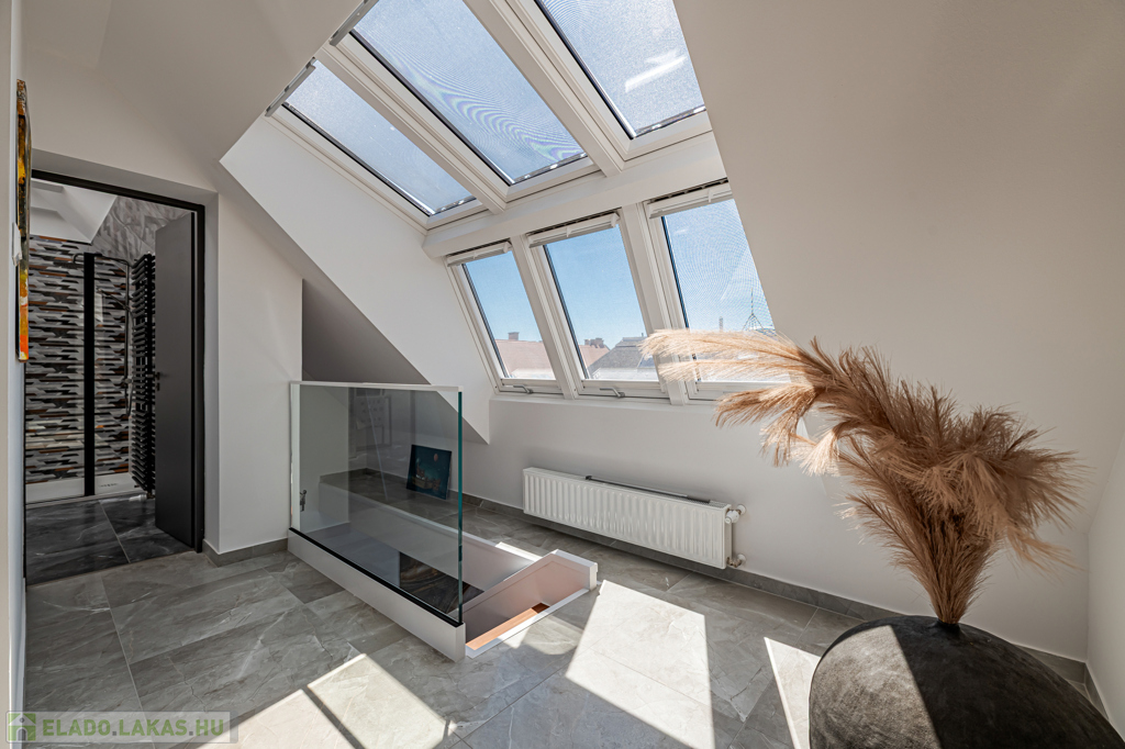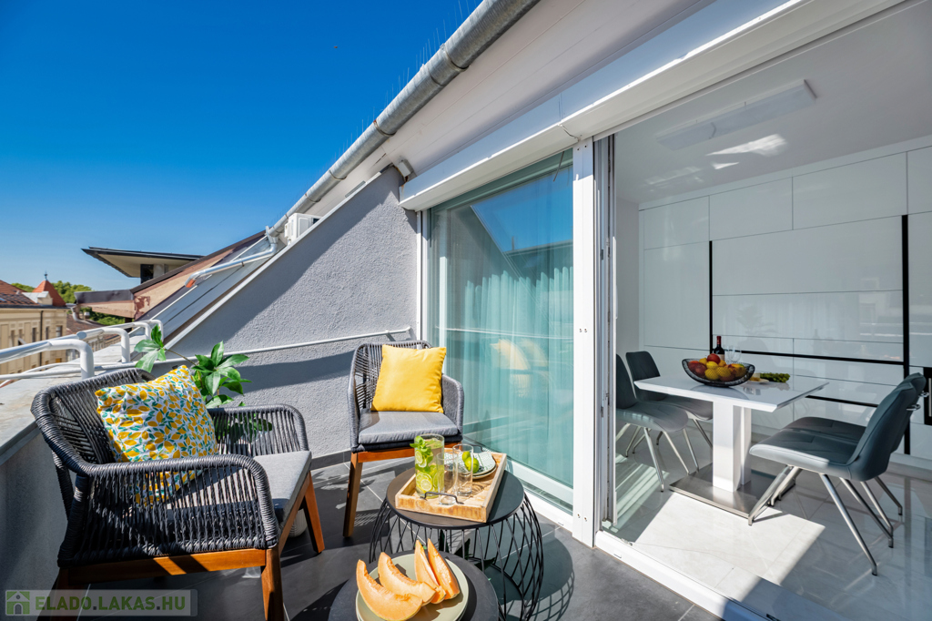 Belvárosban, liftes társasház felső szintjén, modern, minőségi otthon várja Tulajdonosát.