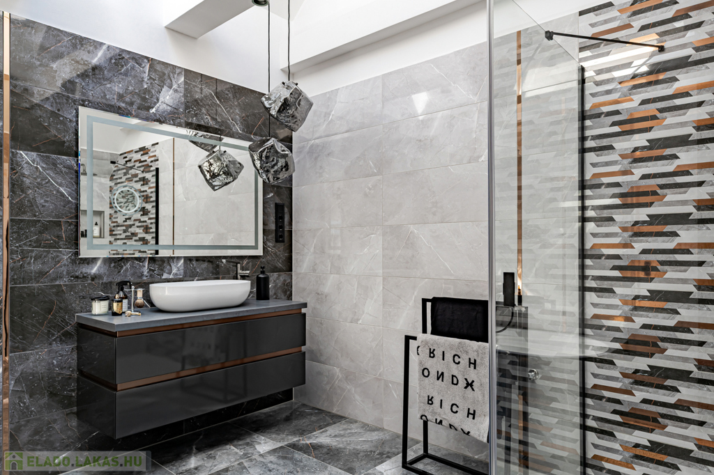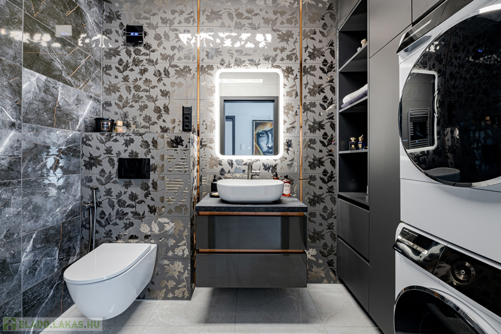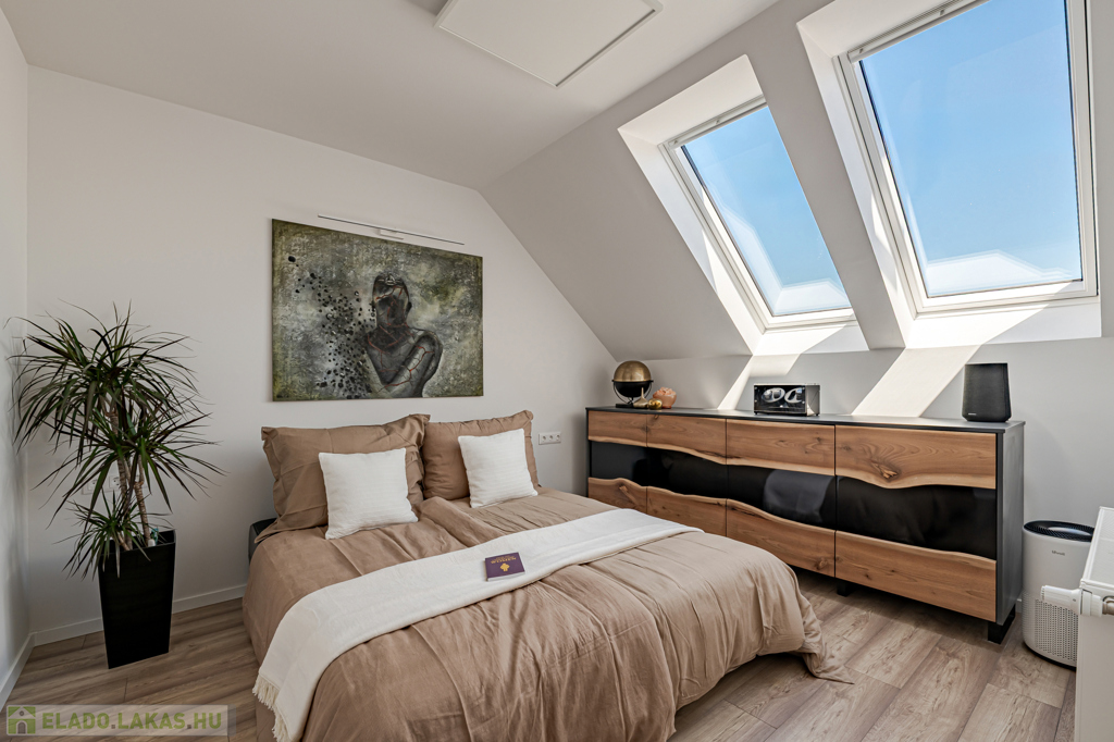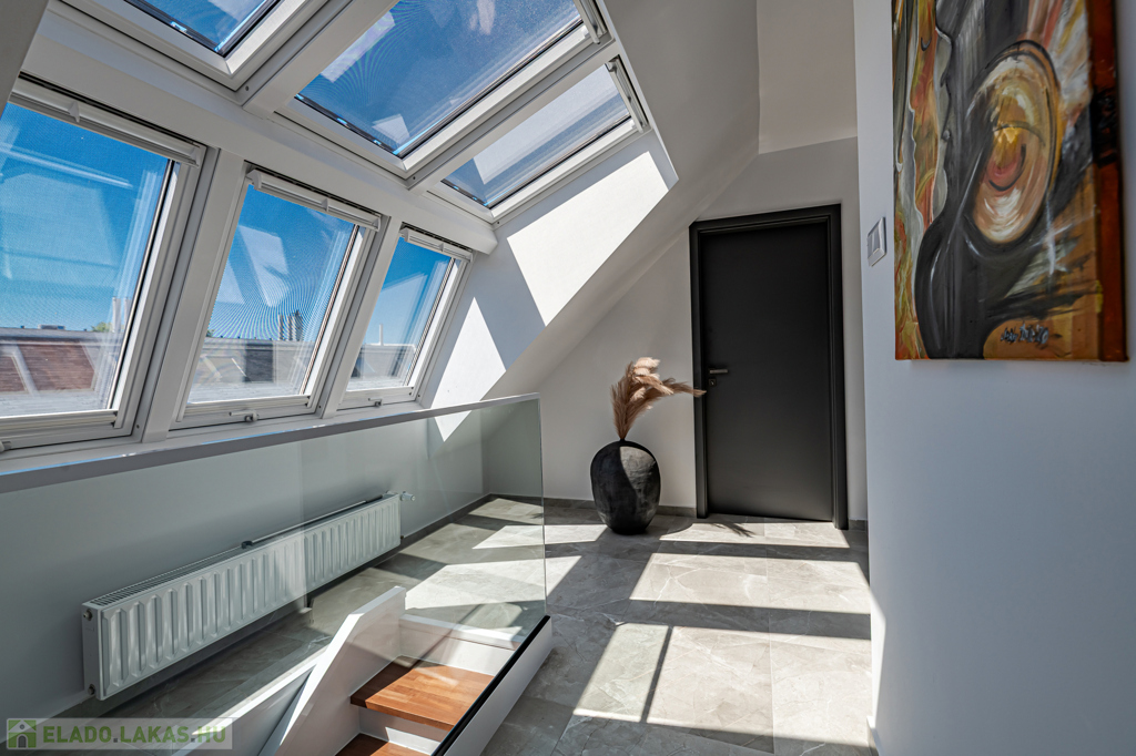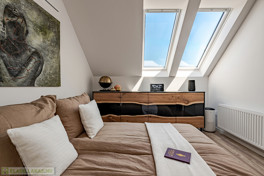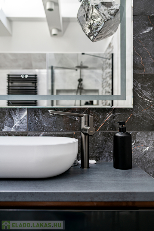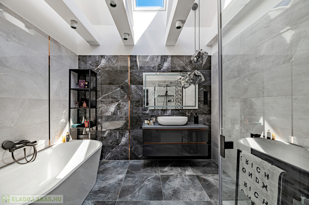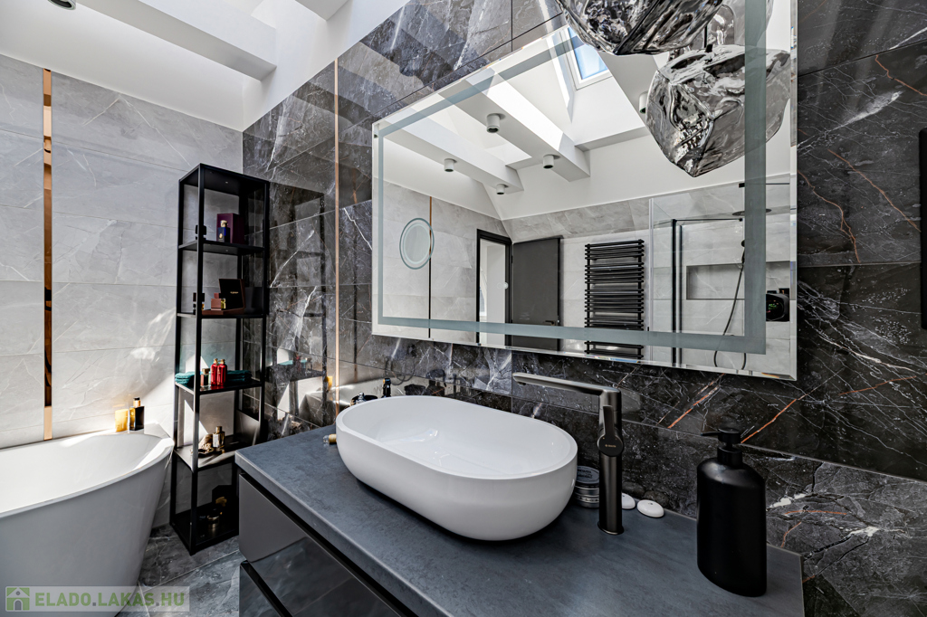 A lakás egyik különlegessége a felső szinten található hatalmas, világos fürdőszoba, a látszógerendákkal, kényelmes méretű zuhannyal, térkáddal, hangulatfényekkel.